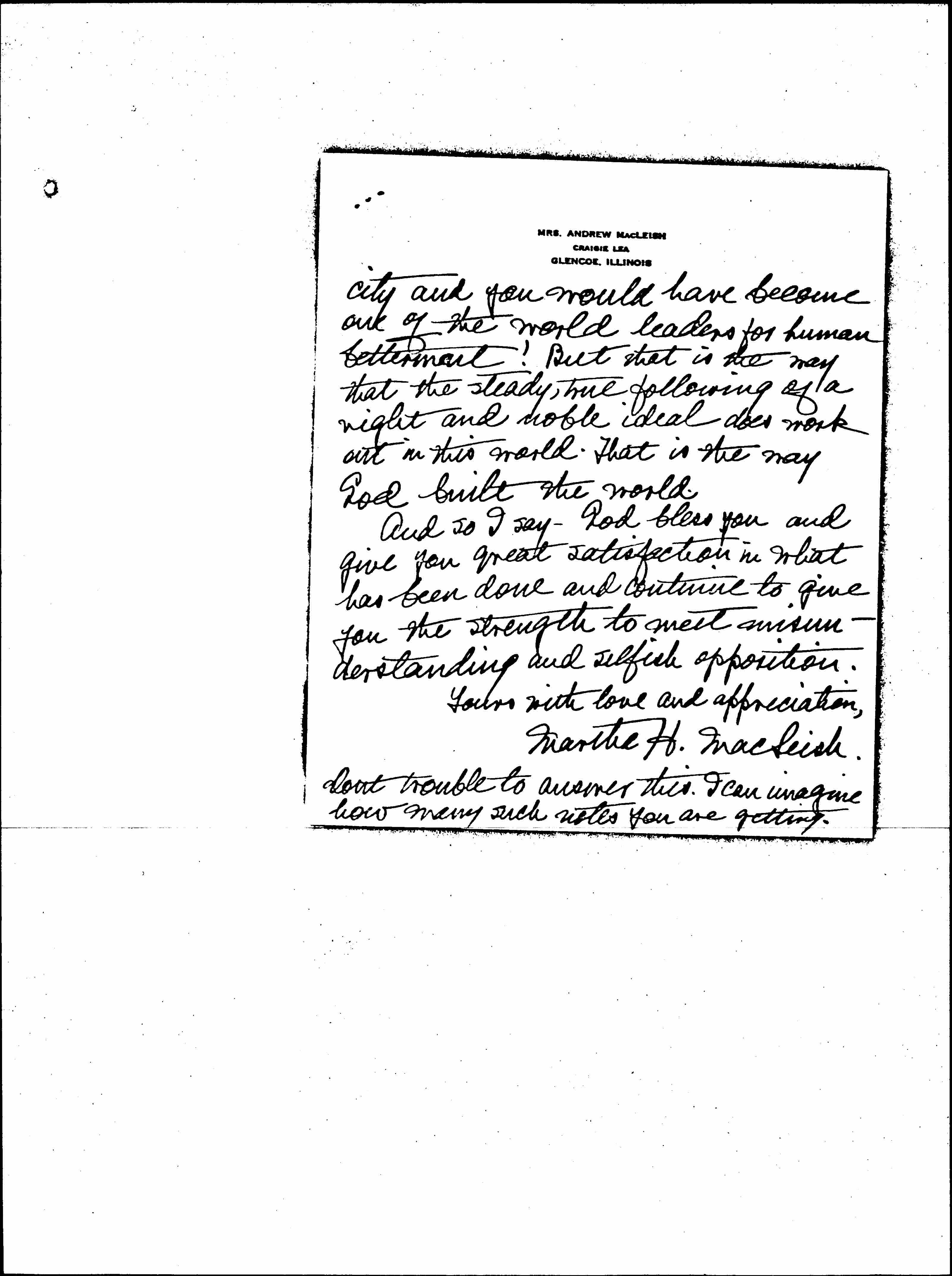 Of course they haven't seemed splendid to you in the doing. You have just gone on meeting one problem or opportunity at a time as they appeared, some of them interesting and stimulating, some of them very hard, but the sum total of the result has [page 2] been a great contribution to better human living. The world is certainly far better for your having lived in it, and nothing much more satisfying than that can be said.