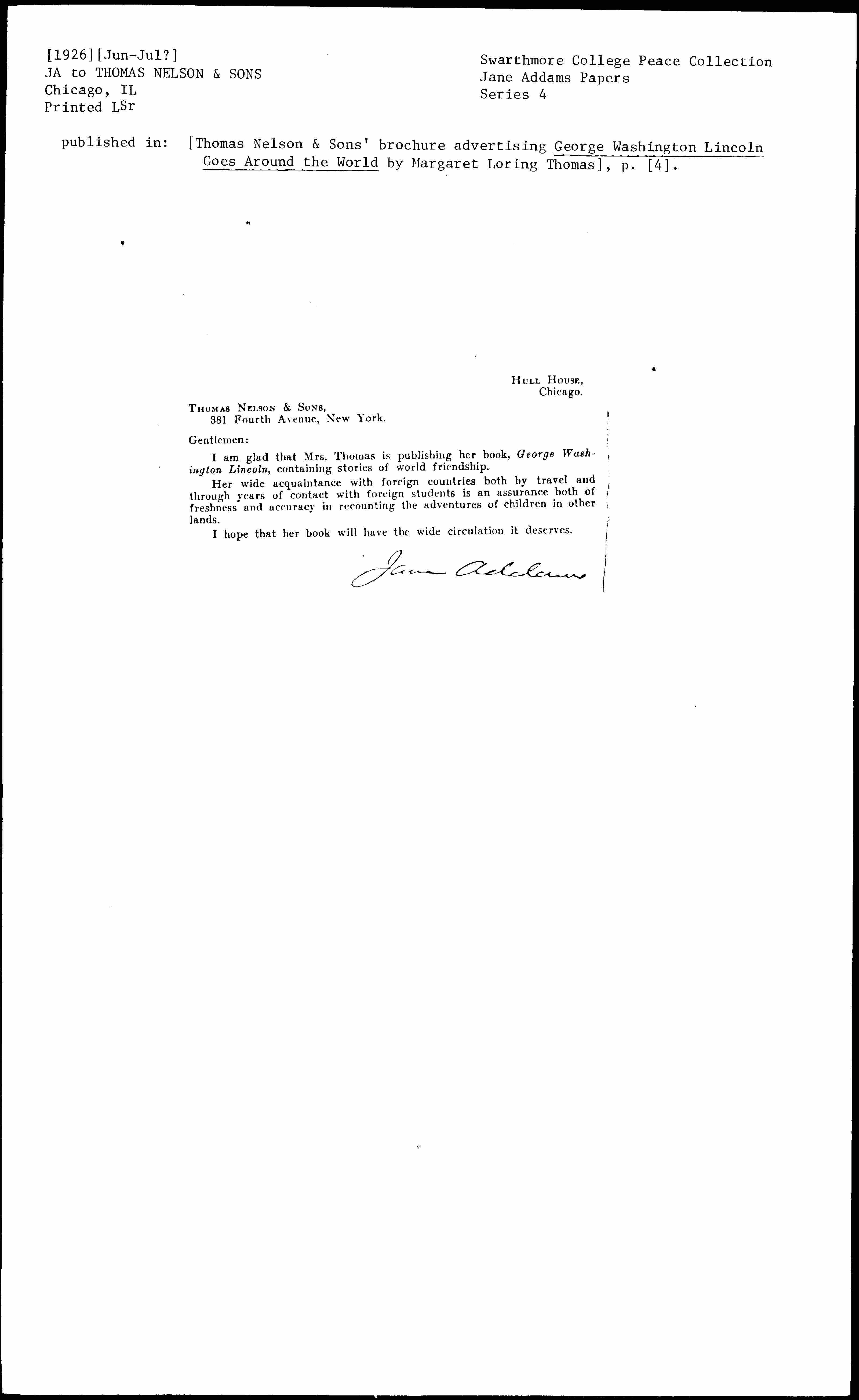 I am glad that Mrs. Thomas is publishing her book, George Washington Lincoln, containing stories of world friendship.