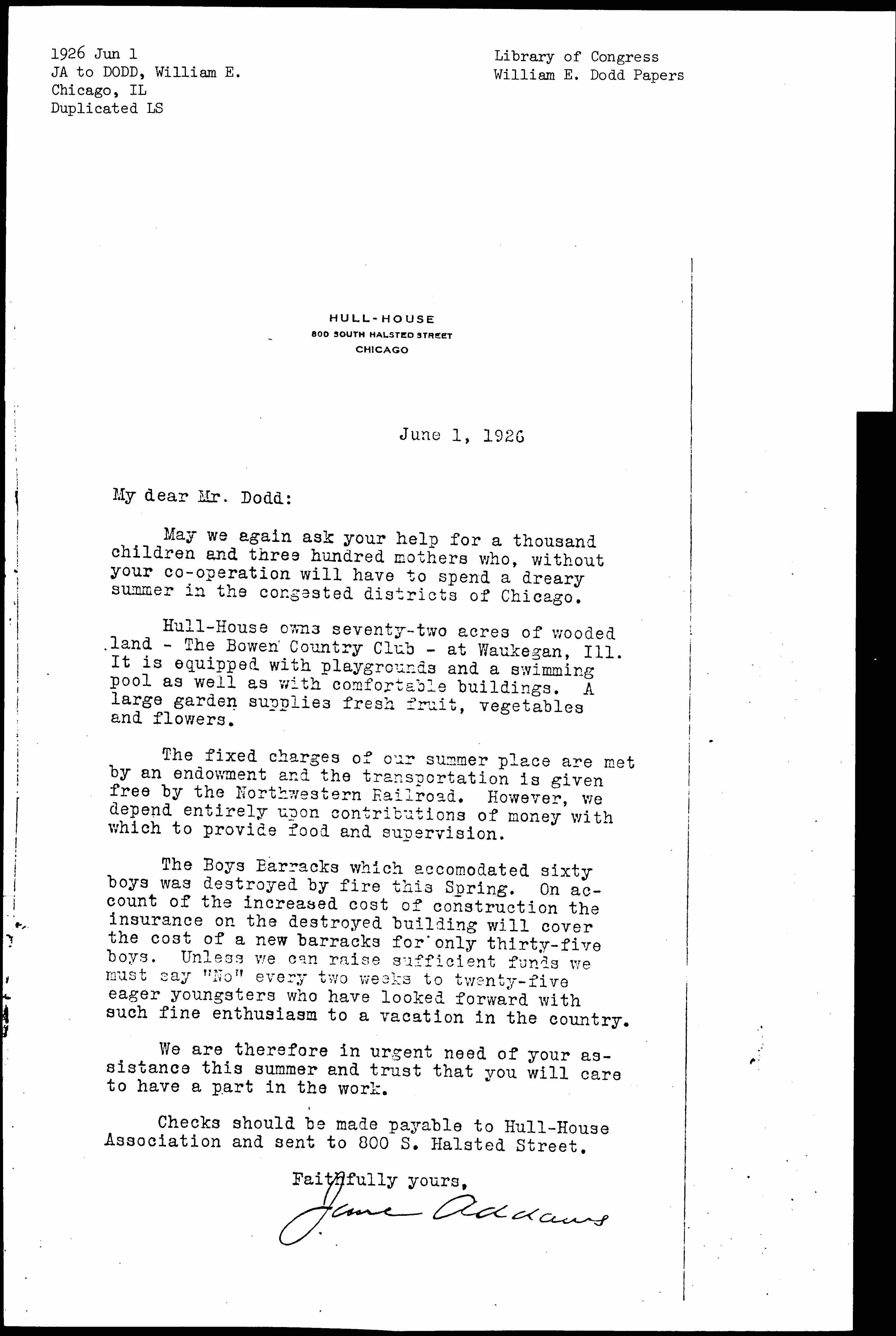 May we again ask your help for a thousand children and three hundred mothers who, without your [cooperation] will have to spend a dreary summer in the congested districts of Chicago.
