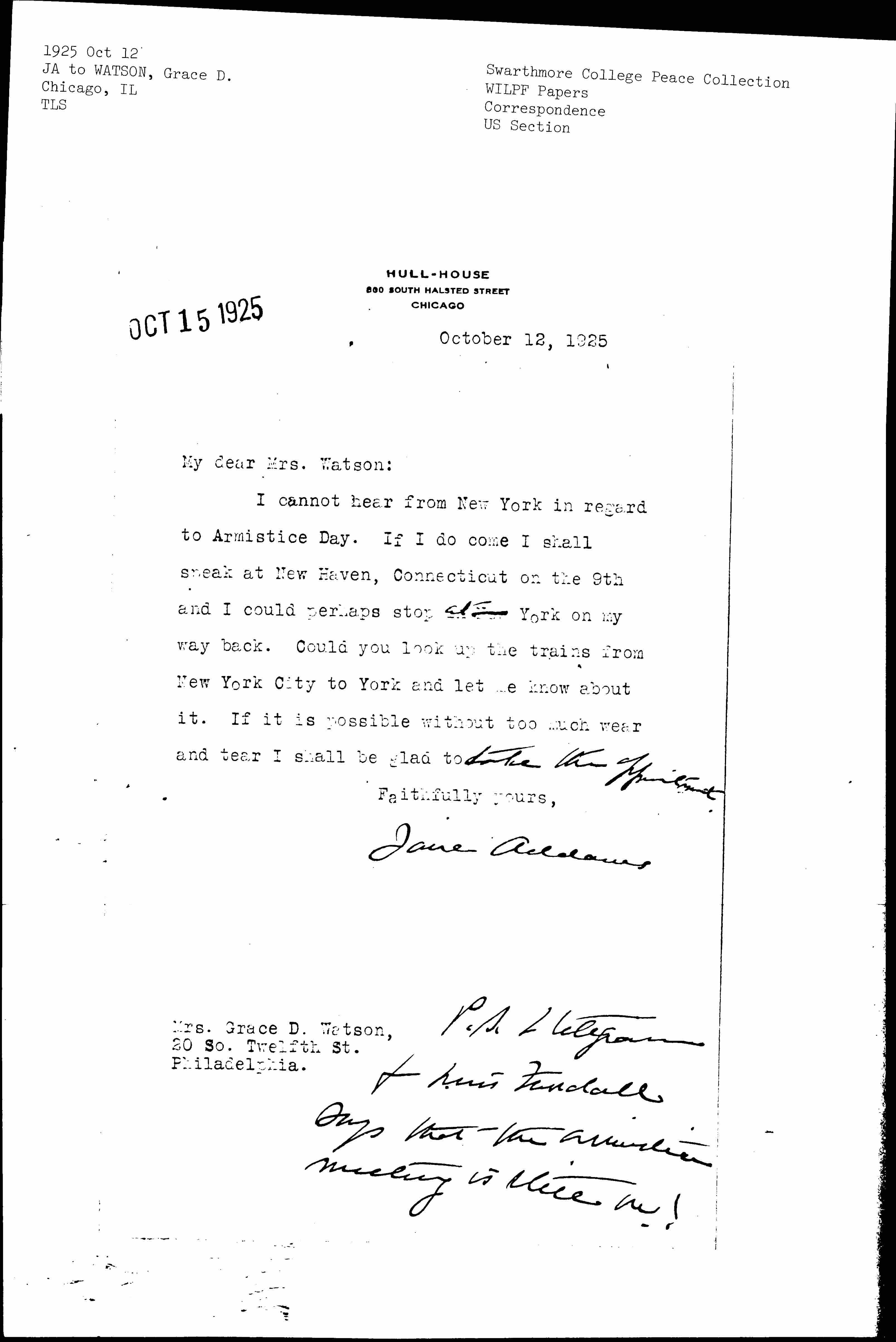 I cannot hear from New York in regard to Armistice Day. If I do come I shall speak at New Haven, Connecticut on the 9th and I could perhaps stop in New ↑at↓ York on my way back. Could you look up the trains from New York City to York and let me know about it. If it is possible without too much wear and tear I shall be glad to ↑take the appointment.↓