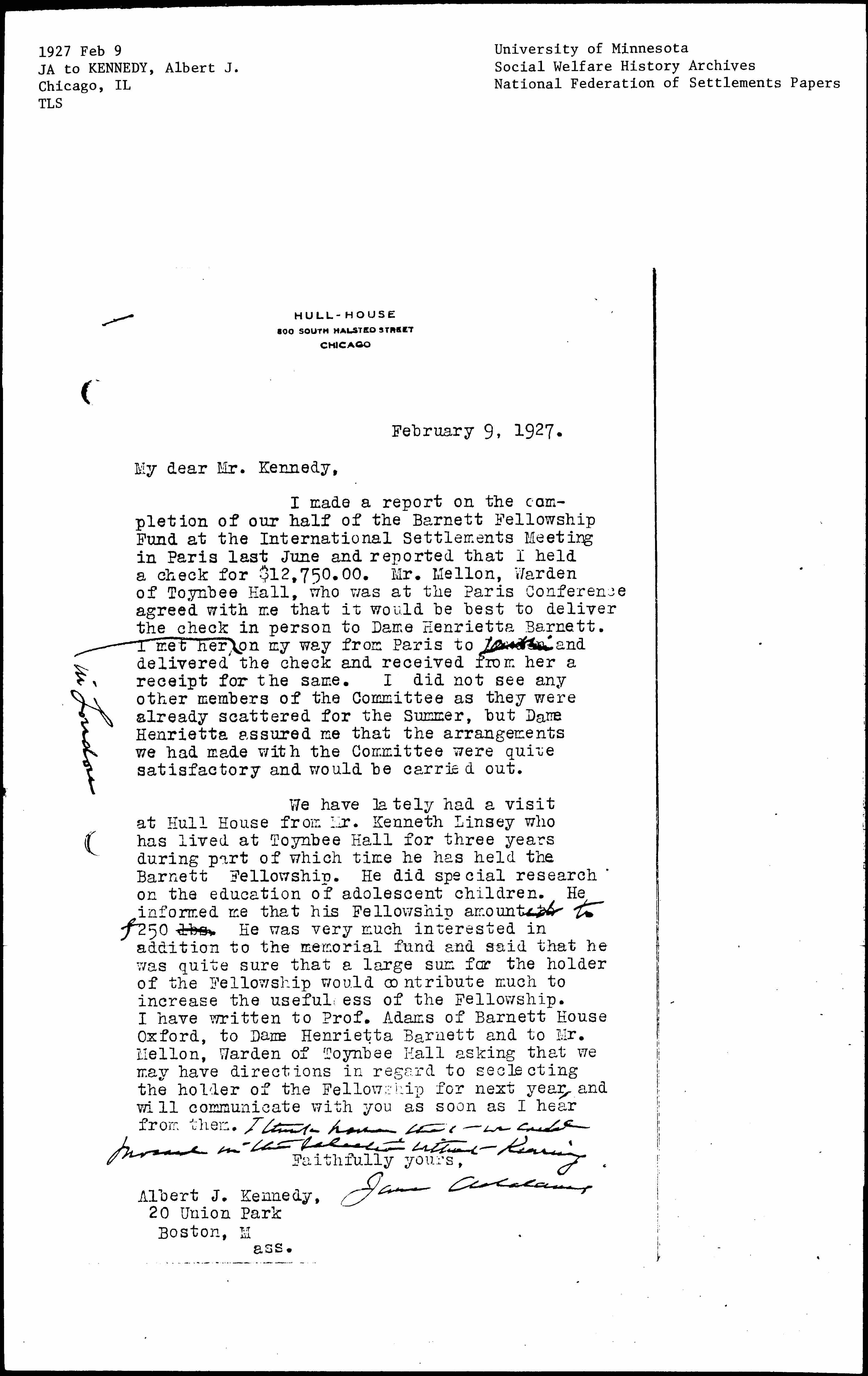 We lately had a visit at Hull House from Mr. Kenneth [Lindsay] who has lived at Toynbee Hall for three years during part of which time he has held the Barnett Fellowship. He did special research on the education of adolescent children. He informed me that his Fellowship [amounted] ↑to↓ ↑£↓250 lbs. He was very much interested in addition to the memorial fund and said that he was quite sure that a large sum for the holder of the Fellowship would contribute much to increase the usefulness of the Fellowship. I have written to Prof. Adams of Barnett House Oxford, to Dame Henrietta Barnett and to Mr. [Mallon], Warden of Toynbee Hall asking that we may have directions in regard to [selecting] the holder of the Fellowship for next year, and will communicate with you as soon as I hear from them. ↑I think however that we could proceed in the selection without hearing.↓