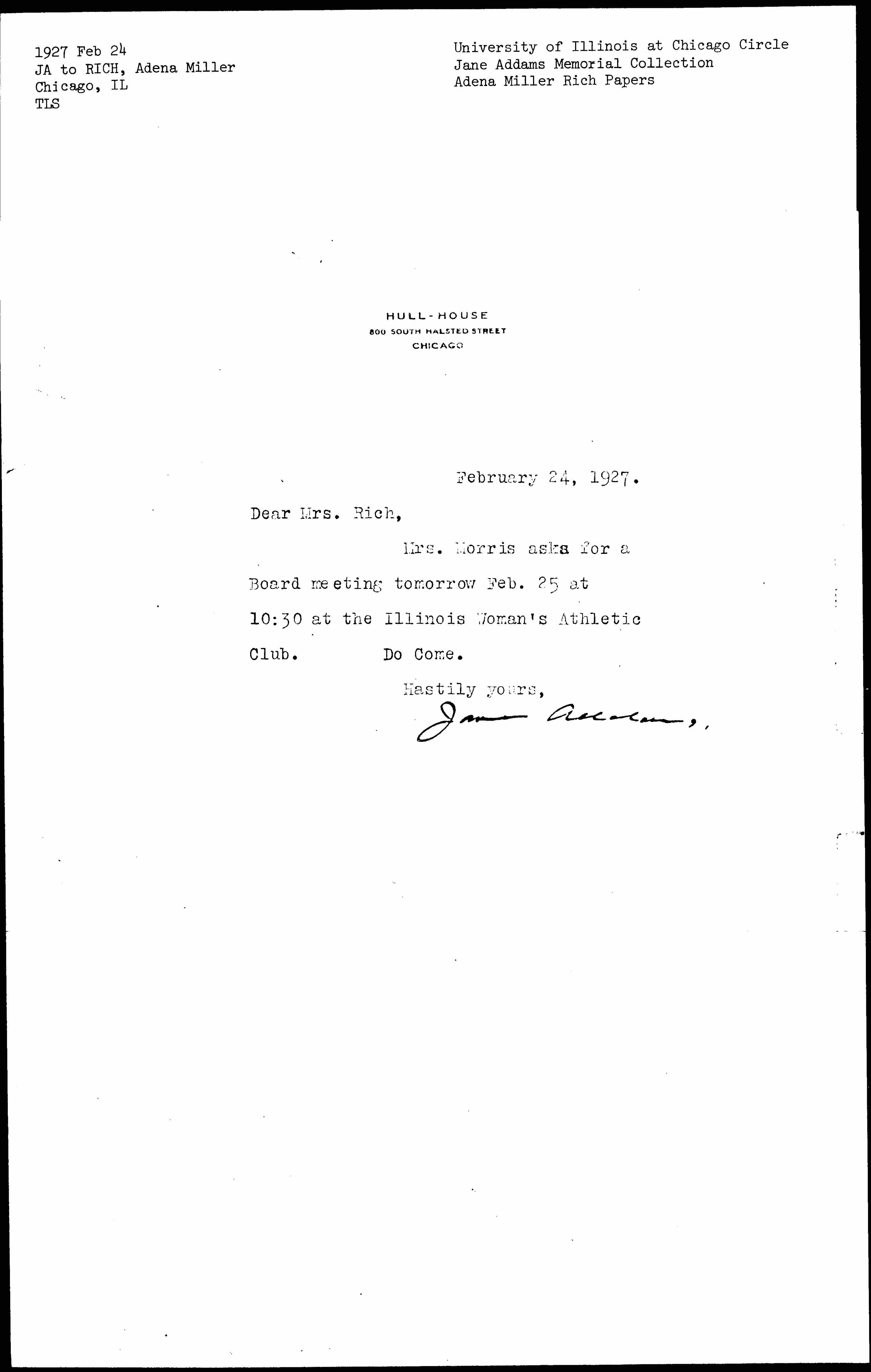 Mrs. Morris asks for a Board meeting tomorrow Feb. 25 at 10:30 at the Illinois Woman's Athletic Club. Do come.