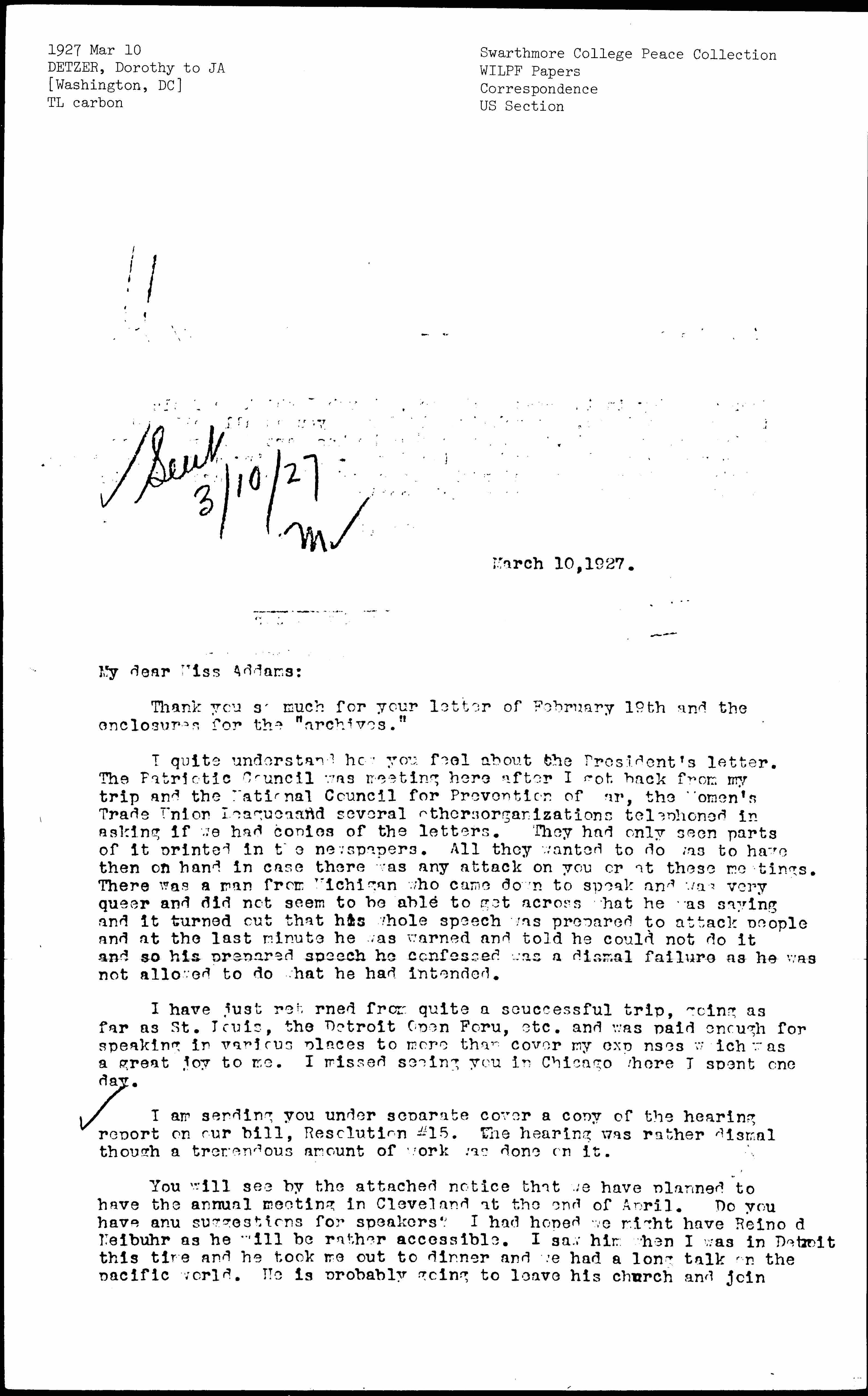 I quite understand how you feel about the President's letter. The Patriotic Council was meeting here after I got back from my trip and the National Council for Prevention of War, the Women's Trade Union League and several other organizations telephoned in asking if we had copies of the letters. They had only seen parts of it printed in the newspapers. All they wanted to do was to have them on hand in case there was any attack on you or at these meetings. There was a man from Michigan who came down to speak and was very queer and did not seem to be able to get across what he was saying and it turned out that his whole speech was prepared to attack people and at the last minute he was warned and told he could not do it and so his prepared speech he confessed was a dismal failure as he was not allowed to do what he had intended.