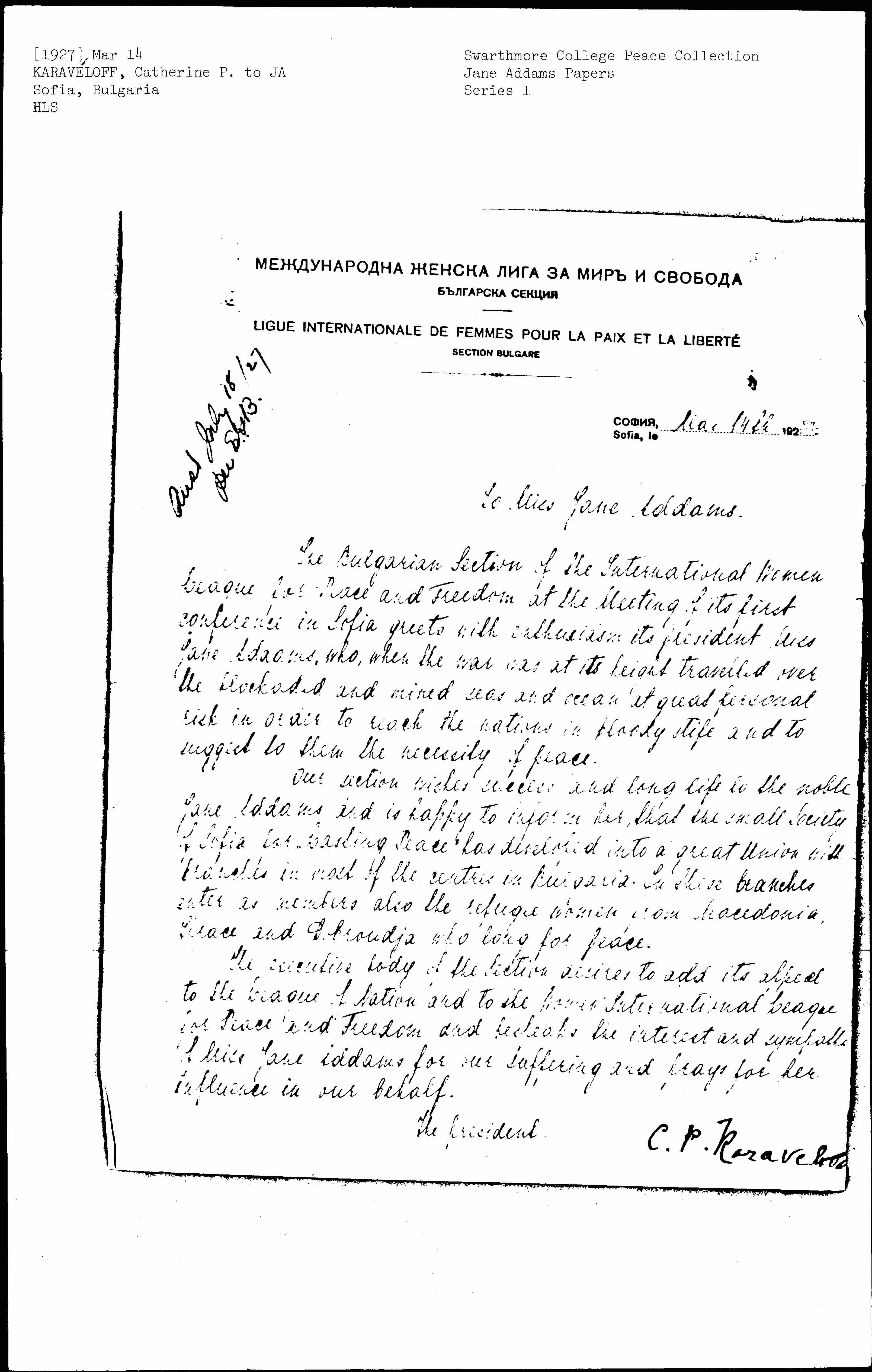The Bulgarian Section of the International Women League for Peace and Freedom at the meeting of its first conference in Sofia greets with enthusiasm its president Miss Jane Addams, who, when the war was at its height [traveled] over the blockaded and mined seas and ocean at great personal risk in order to reach the nations in bloody strife and to suggest to them the necessity of peace.