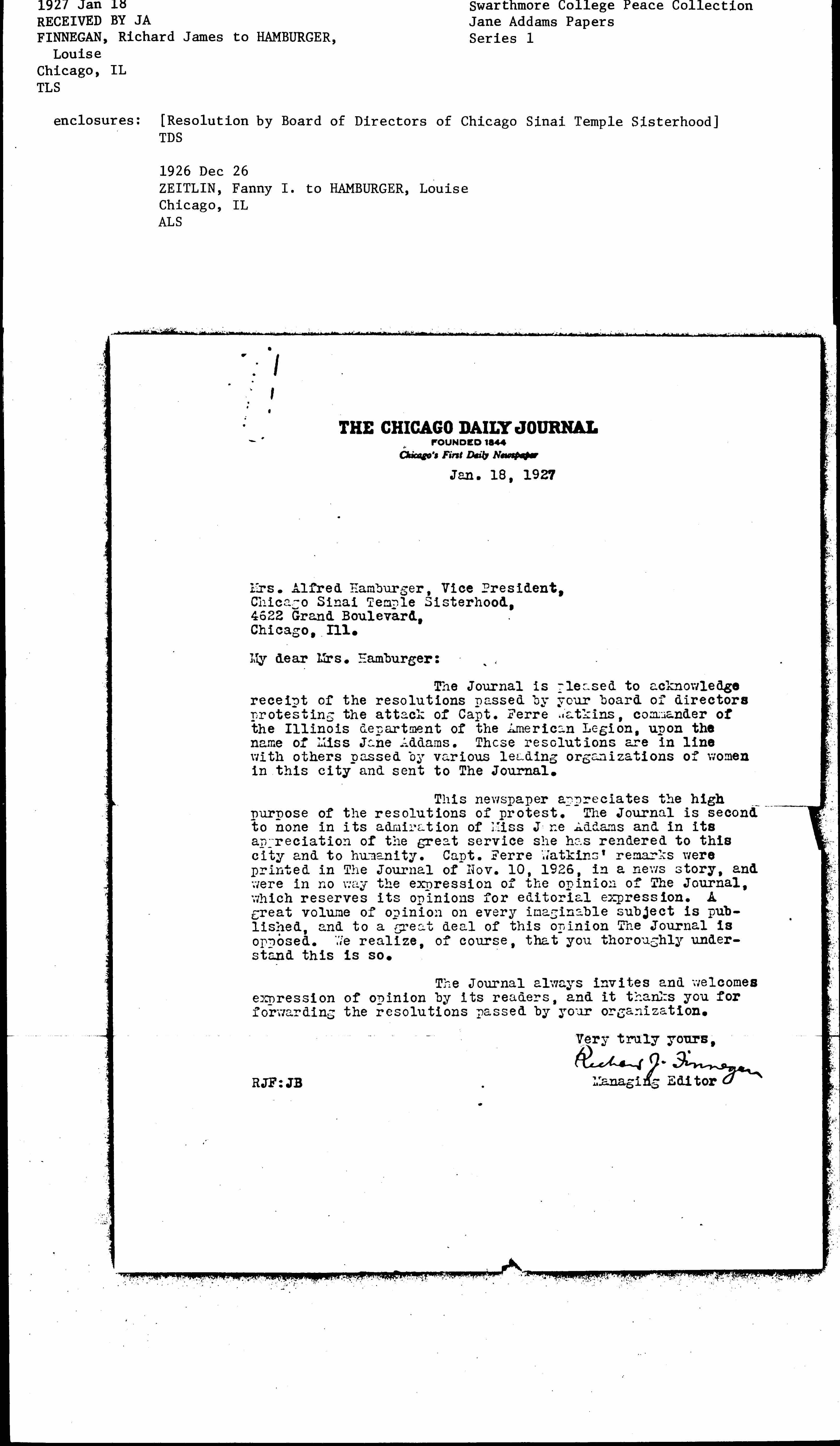 The Journal is pleased to acknowledge receipt of the resolutions passed by your board of directors protesting the attack of Capt. Ferre Watkins, commander of the Illinois department of the American Legion, upon the name of Miss Jane Addams. Those resolutions are in line with others passed by various leading organizations of women in this city and sent to The Journal.