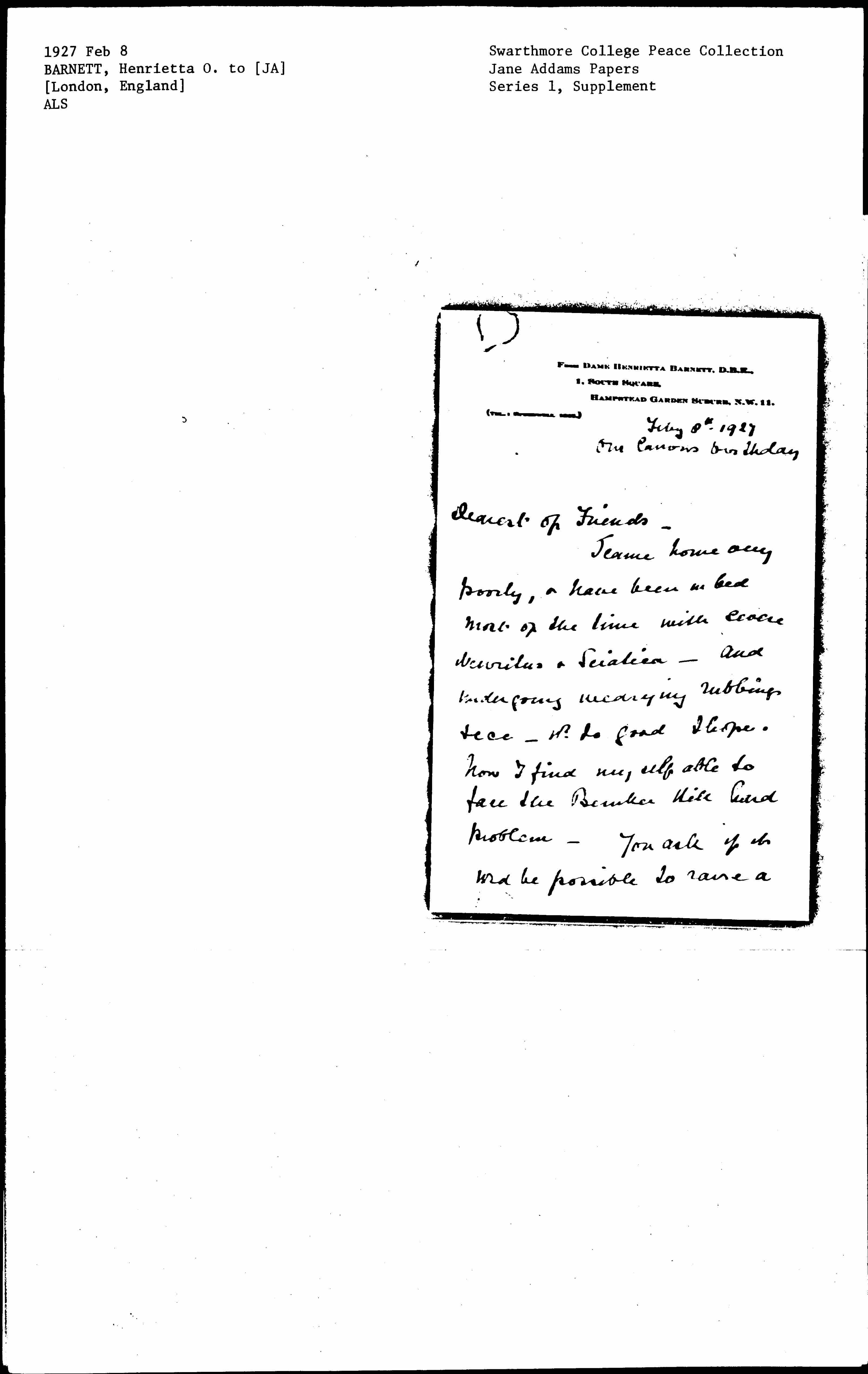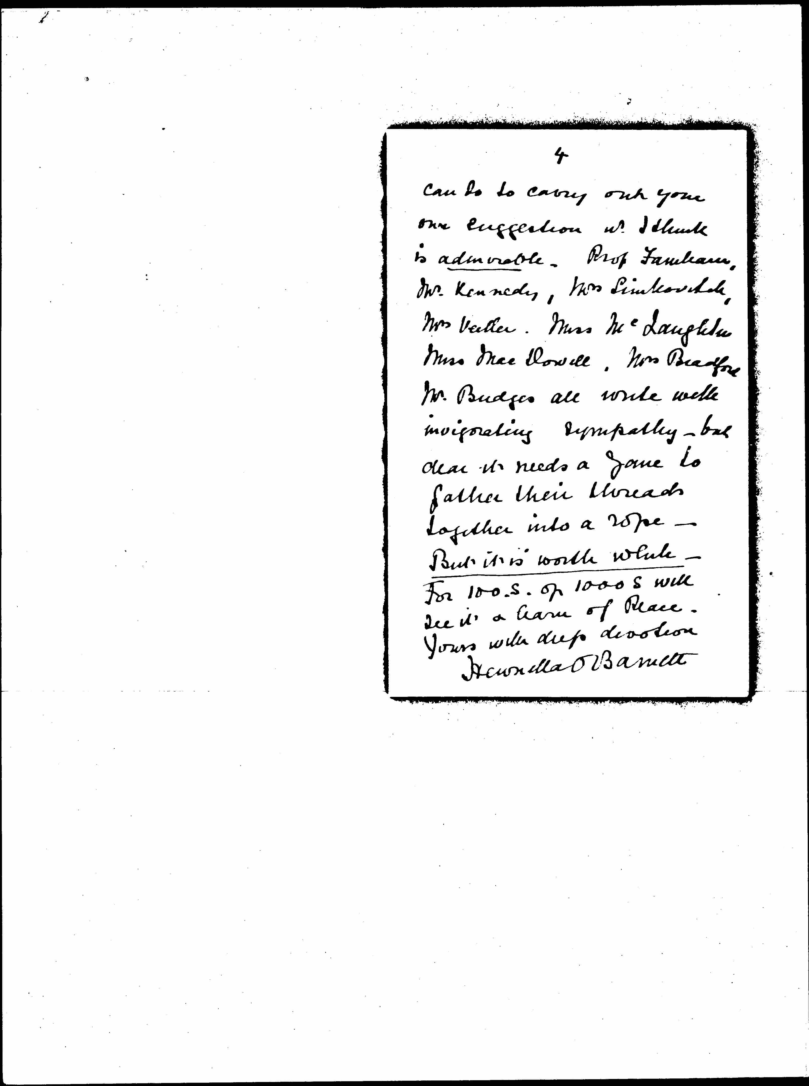 Will you see what you [page 4] can do to carry out your own suggestion [which] I think is admirable. Prof [Farnam], Mr Kennedy, Mrs Simkhovitch, Mrs Veiller, Miss McLaughlin, Miss [McDowell], Mrs Bradford, Mr. [Bridges] all write with invigorating sympathy -- but dear it needs a Jane to gather their threads together into a rope -- But it is worth while -- For 100s of 1000s will see it & learn of Peace.