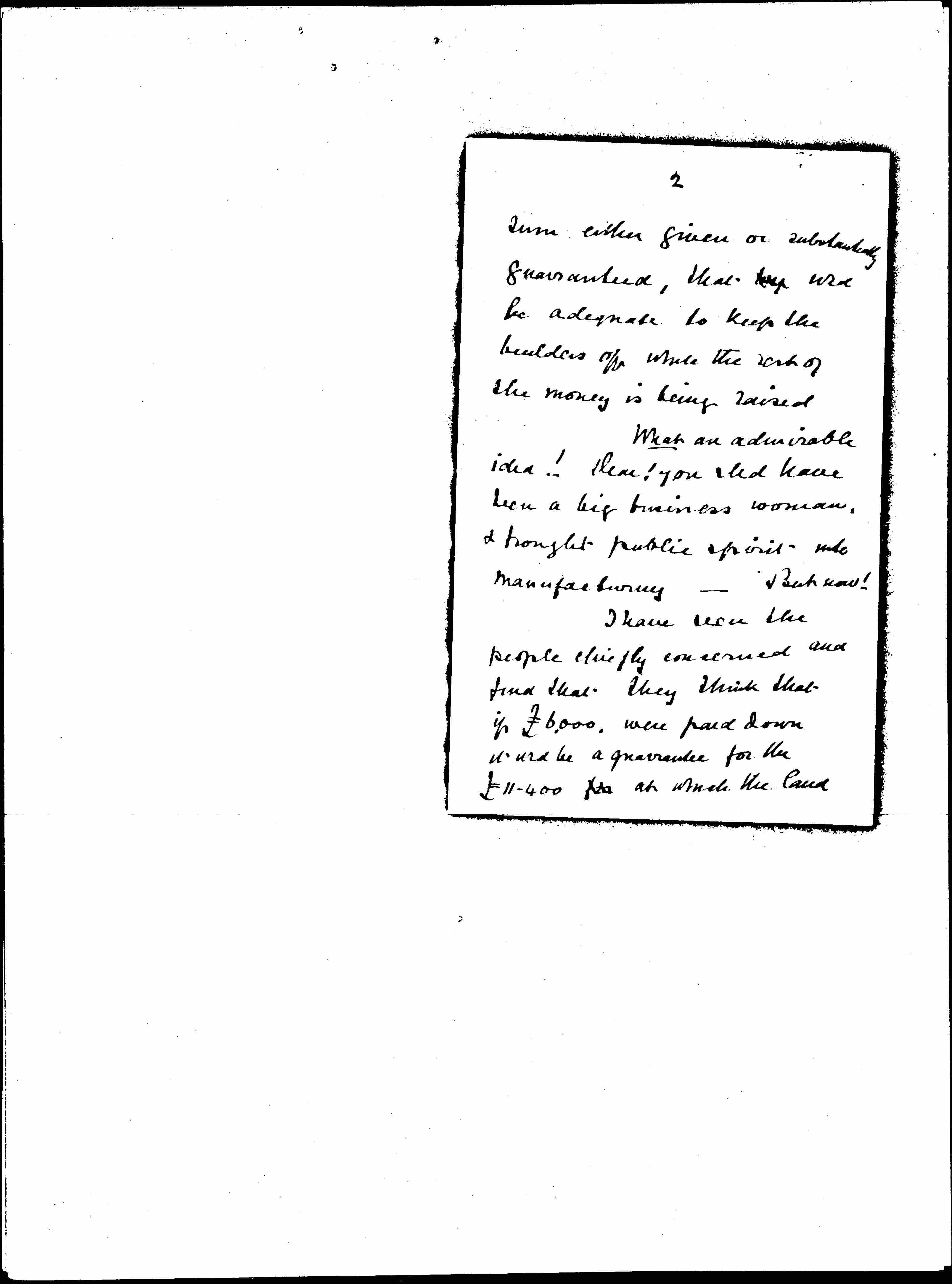 I came home very poorly, & have been in bed most of the time with severe neuritis & sciatica -- and undergoing wearying rubbings [etc.] -- wd do good I hope. Now I find myself able to face the Bunker Hill land problem. You ask if it wld be possible to raise a [page 2] sum either given or substantially guaranteed, that [illegible] wld be adequate to keep the builders off while the rest of the money is being raised.