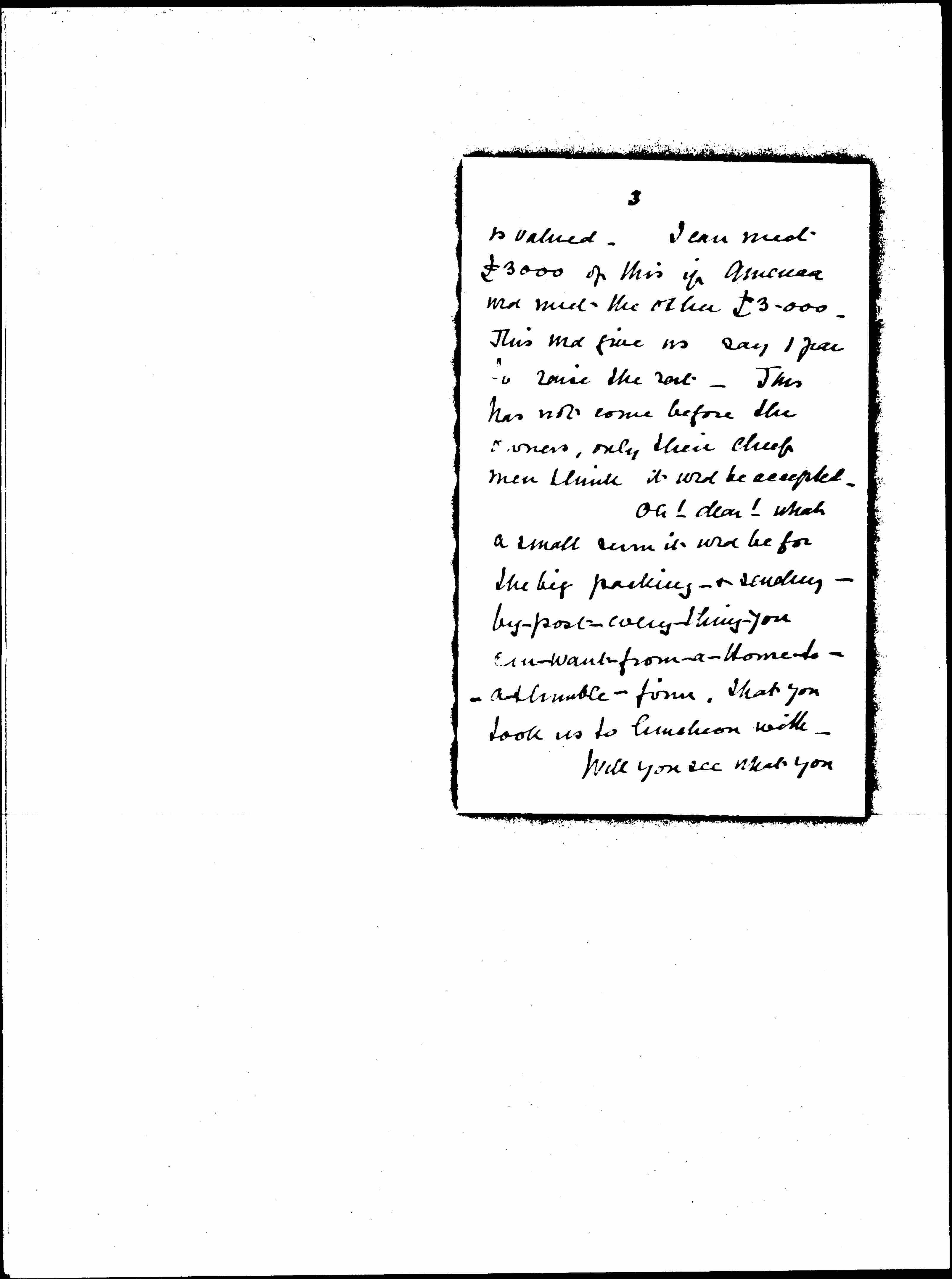 I have seen the people chiefly concerned and find that they think that if £6,000 were paid down it would be a guarantee for the £11-400 for at which the land [page 3] is valued. I can meet £3000 of this if America wld meet the other £3,000. This wld give us say 1 year to raise the rest. This has not come before the [owners], only their chief men I think it wld be accepted.