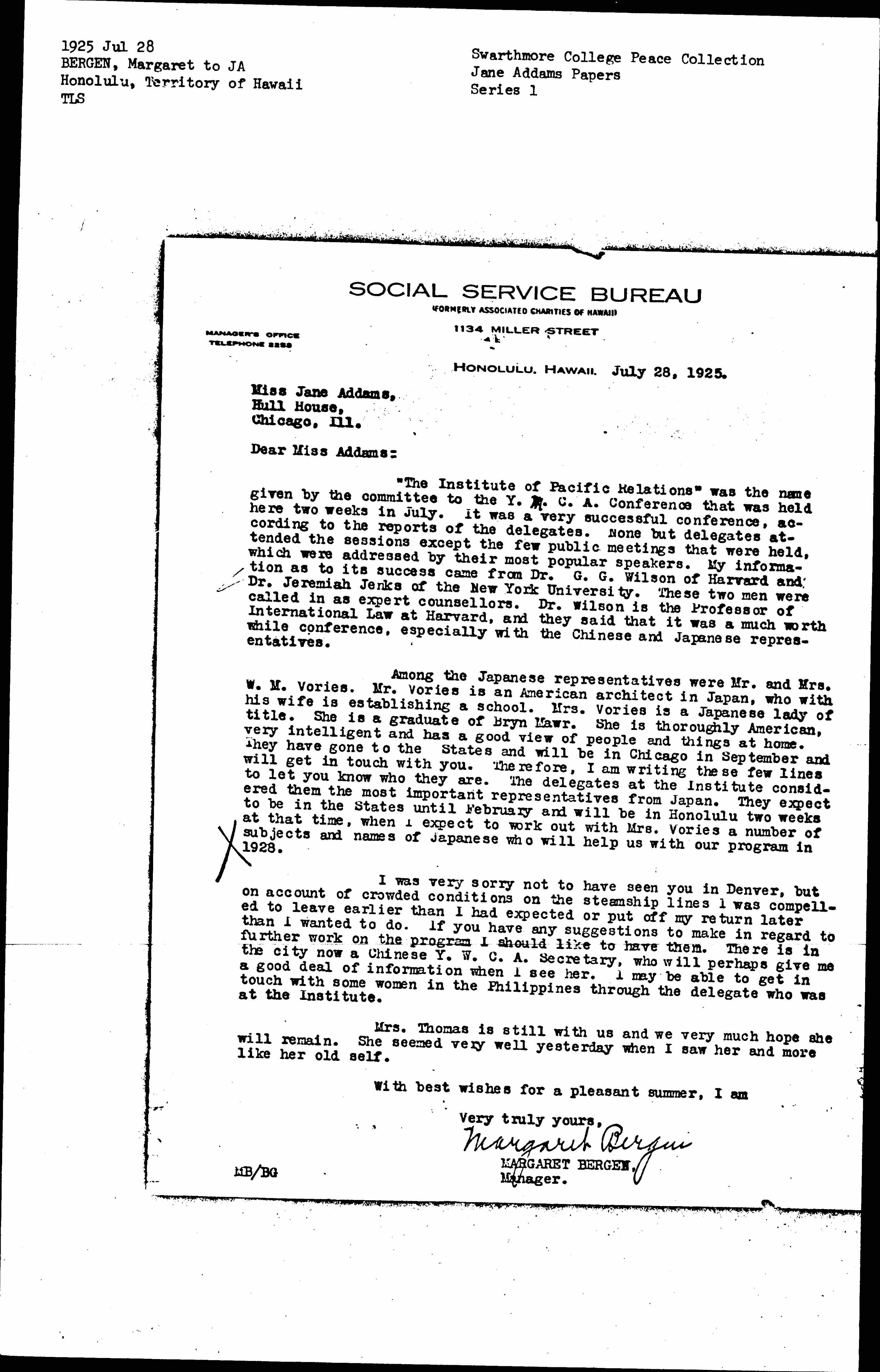 Among the Japanese representatives were Mr. and Mrs. W. M. Vories. Mr. Vories is an American architect in Japan, who with his wife is establishing a school. Mrs. Vories is a Japanese lady of title. She is a graduate of Bryn Mawr. She is thoroughly American, very intelligent and has a good view of people and things at home. They have gone to the States and will be in Chicago in September and will get in touch with you. Therefore, I am writing these few lines to let you know who they are. The delegates at the Institute considered them the most important representatives from Japan. They expect to be in the States until February and will be in Honolulu two weeks at that time, when I expect to work out with Mrs. Vories a number of subjects and names of Japanese who will help us with our program in 1928.