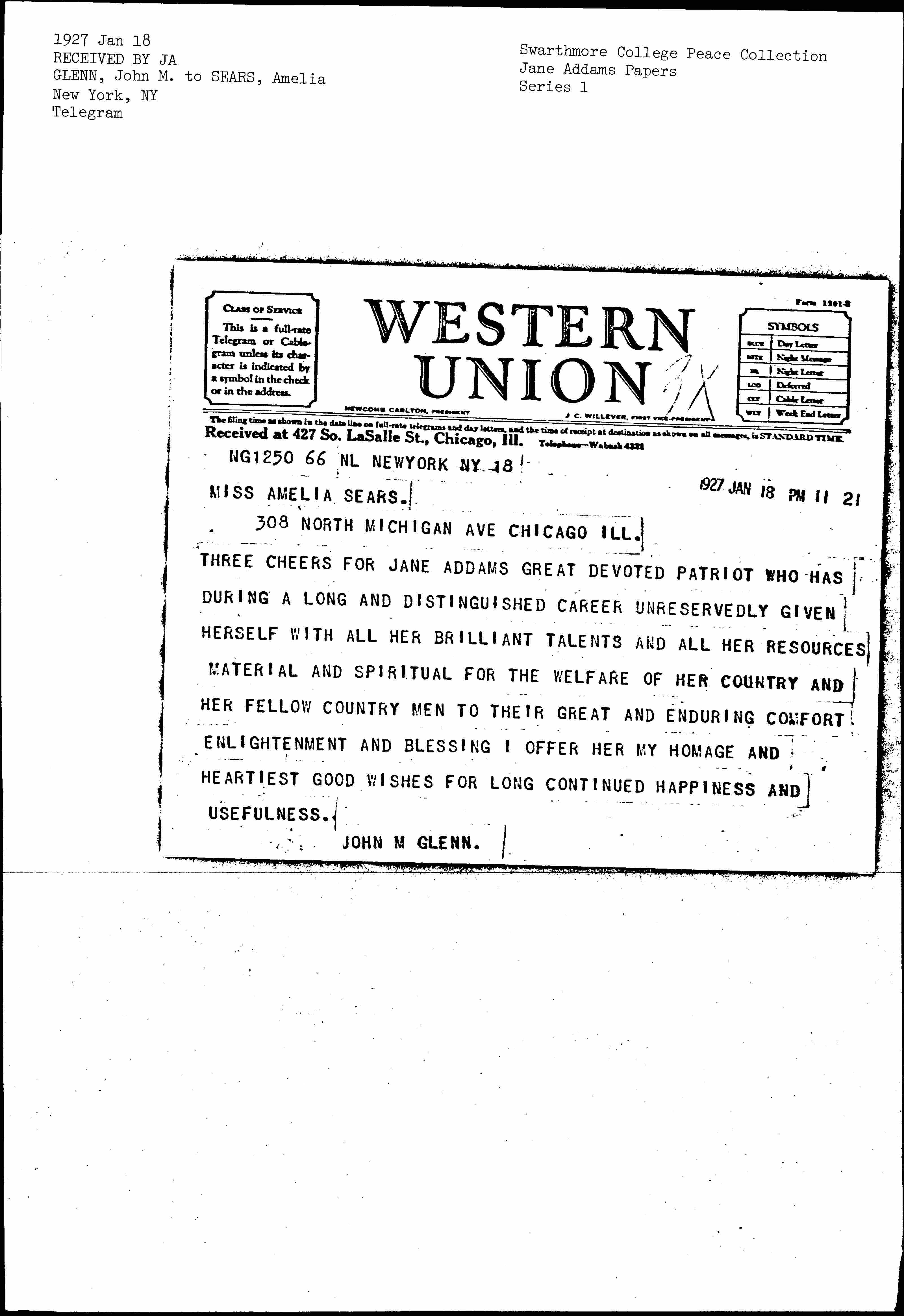 THREE CHEERS FOR JANE ADDAMS GREAT DEVOTED PATRIOT WHO HAS DURING A LONG AND DISTINGUISHED CAREER UNRESERVEDLY GIVEN HERSELF WITH ALL HER BRILLIANT TALENTS AND ALL HER RESOURCES MATERIAL AND SPIRITUAL FOR THE WELFARE OF HER COUNTRY AND HER FELLOW COUNTRY MEN TO THEIR GREAT AND ENDURING COMFORT ENLIGHTENMENT AND BLESSING I OFFER HER MY HOMAGE AND HEARTIEST GOOD WISHES FOR LONG CONTINUED HAPPINESS AND USEFULNESS.