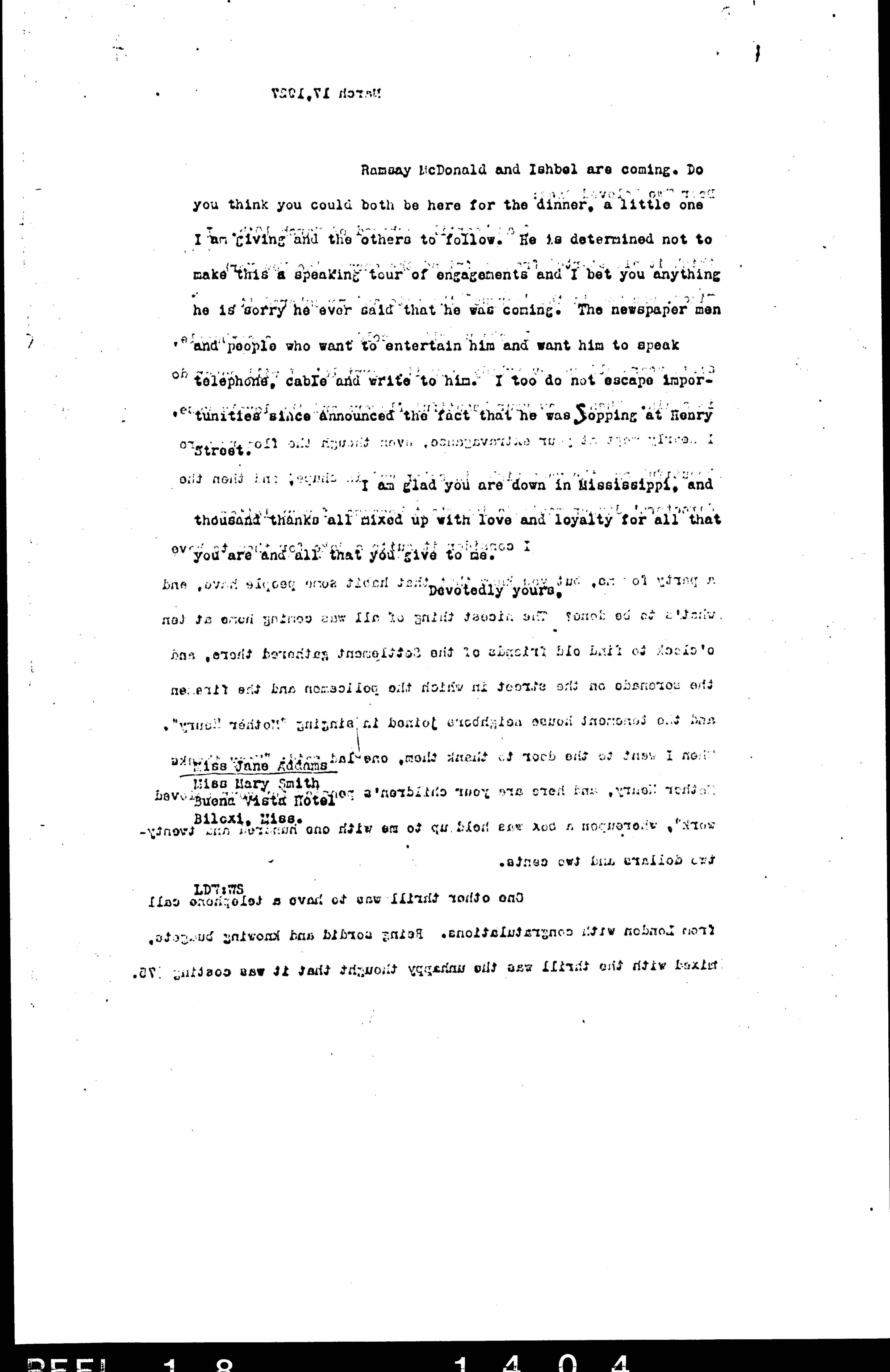 Ramsay [MacDonald] and Ishbel are coming. Do you think you could both be here for the dinner, a little one I am giving and the others to follow. He is determined not to make this a speaking tour of engagements and I bet you anything he is sorry he ever said that he was coming. The newspaper men and people who want to entertain him and want him to speak telephone, cable and write to him. I too do not escape importunities since announced the fact that he was stopping at Henry Street.