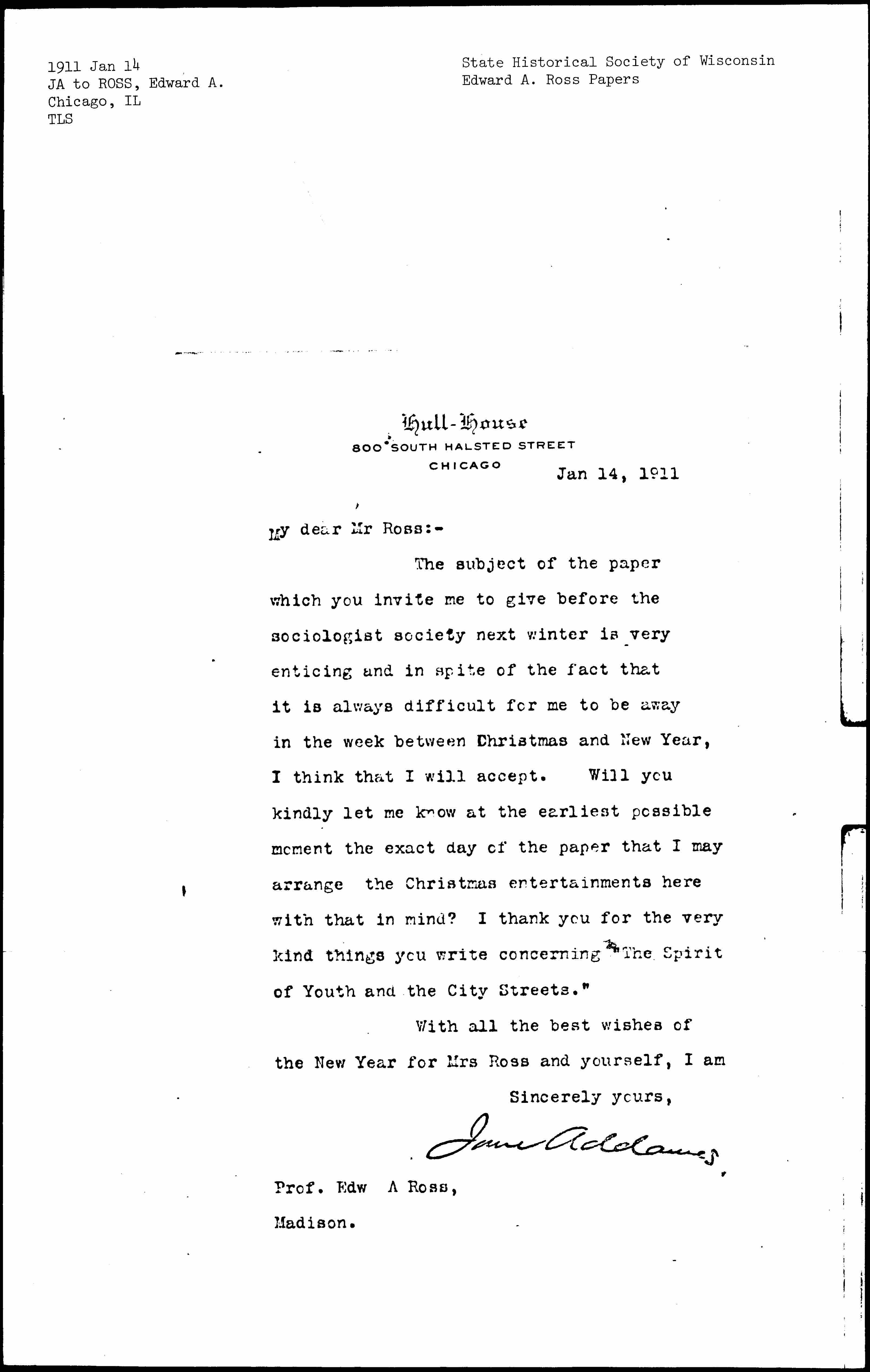The subject of the paper which you invite me to give before the sociologist society next winter is very enticing and in spite of the fact that it is always difficult for me to be away in the week between Christmas and New Year, I think that I will accept. Will you kindly let me know at the earliest possible moment the exact day of the paper that I may arrange the Christmas entertainments here with that in mind? I thank you for the very kind things you write concerning "The Spirit of Youth and the City Streets."