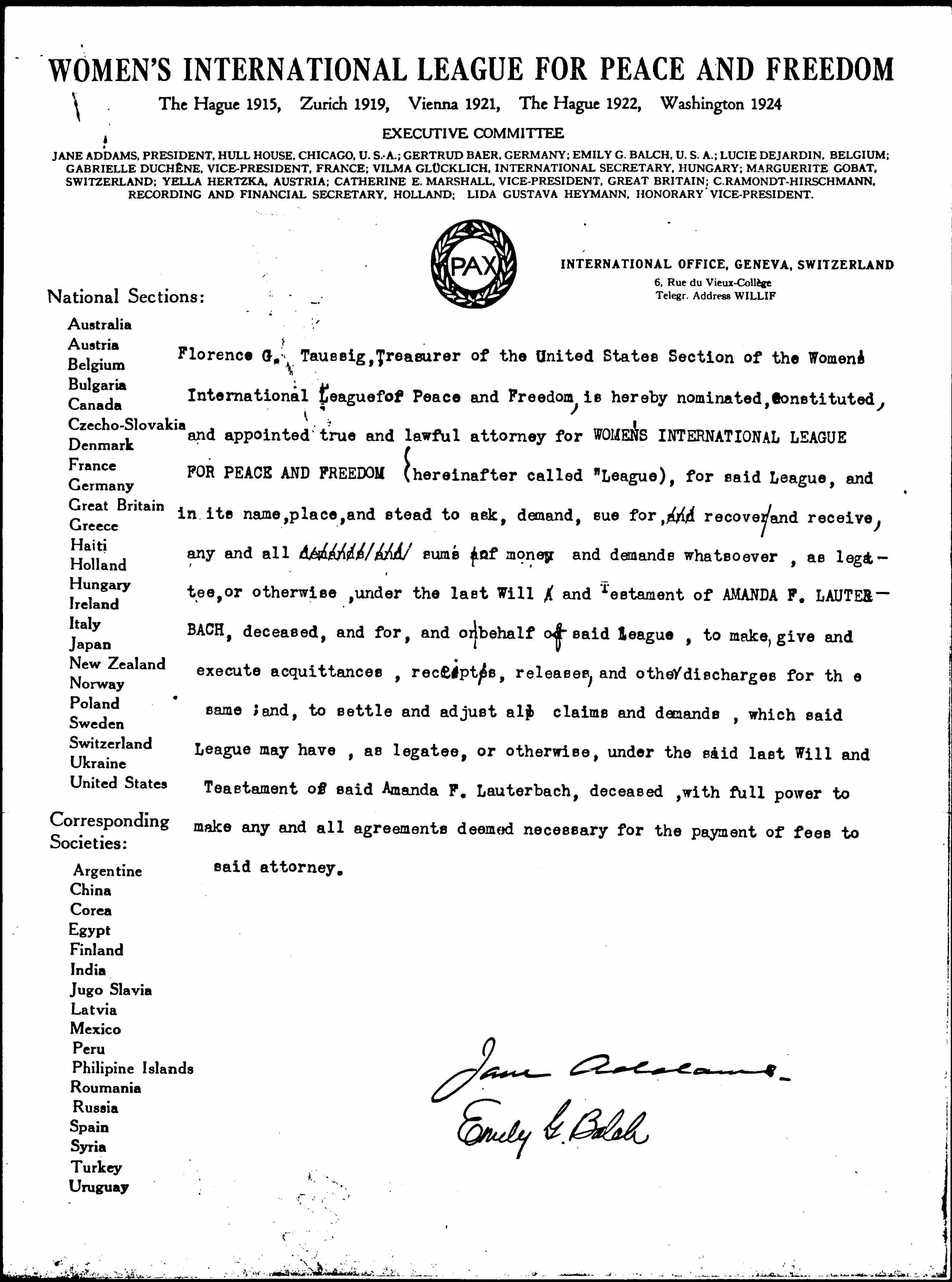 Florence G. Taussig, Treasurer of the United States Section of the Women's International League for Peace and Freedom, is hereby nominated, constituted, and appointed true and lawful attorney for WOMEN'S INTERNATIONAL LEAGUE FOR PEACE AND FREEDOM (hereinafter called "League"), for said League, and in its name, place, and stead to ask, demand, sue for, and recover and receive, any and all demands and sums of money and demands whatsoever, as legatee, or otherwise, under the last Will A and Testament of AMANDA F. LAUTERBACH, deceased, and for, and on behalf of said League, to make, give and execute acquittances, receipts, releases, and other discharges for the same; and, to settle and adjust all claims and demands, which said League may have, as legatee, or otherwise, under the said last Will and Testament of said Amanda F. Lauterbach, deceased, with full power to make any and all agreements deemed necessary for the payment of fees to said attorney.
