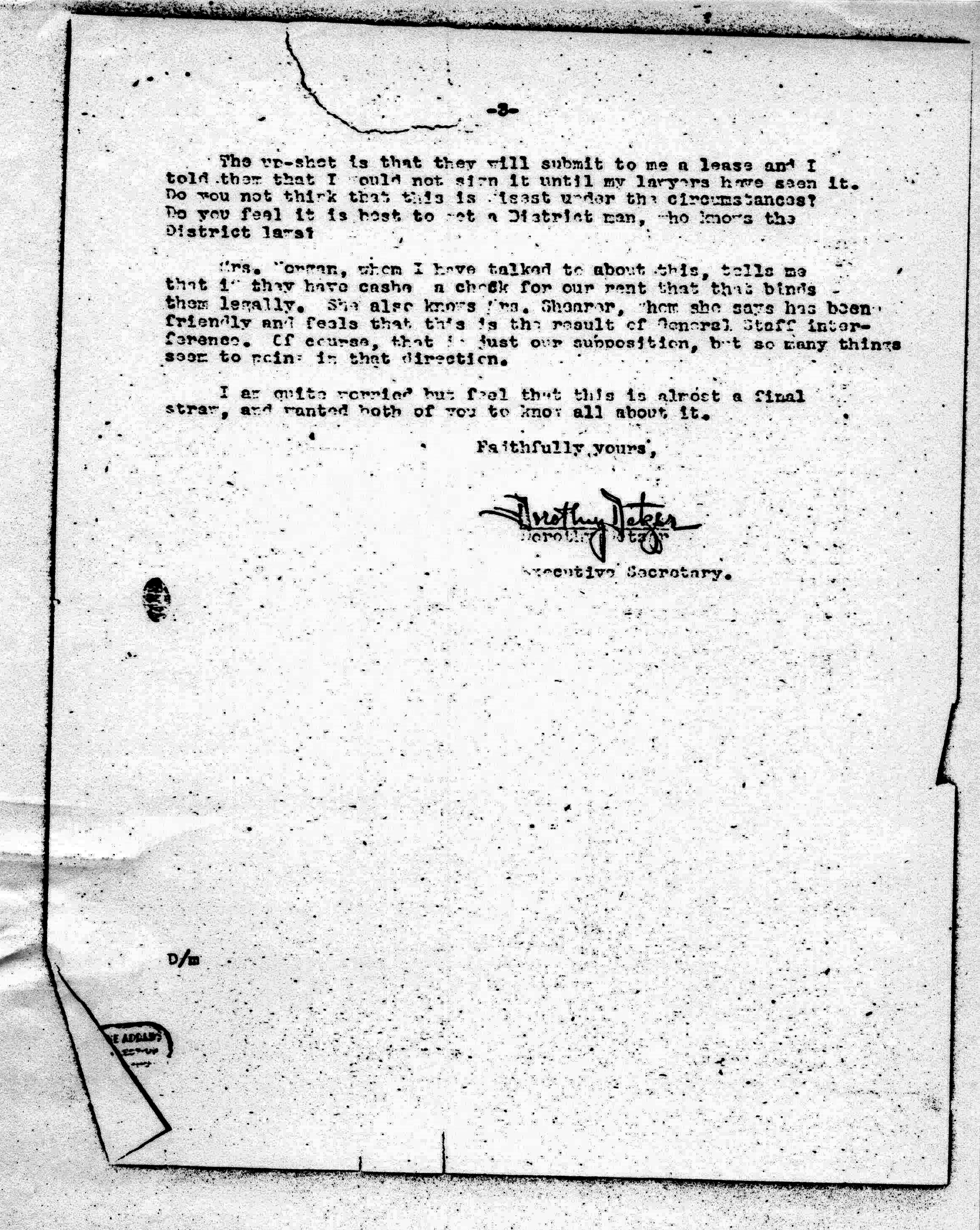 Mrs. Morgan, whom I have talked to about this, tells me that if they have [cashed] a check for our rent that that binds them legally. She also knows Mrs. Shearer, whom she says has been friendly and feels that this is the result of General Staff interference. Of course, that is just our supposition, but so many things seem to [point] in that direction.