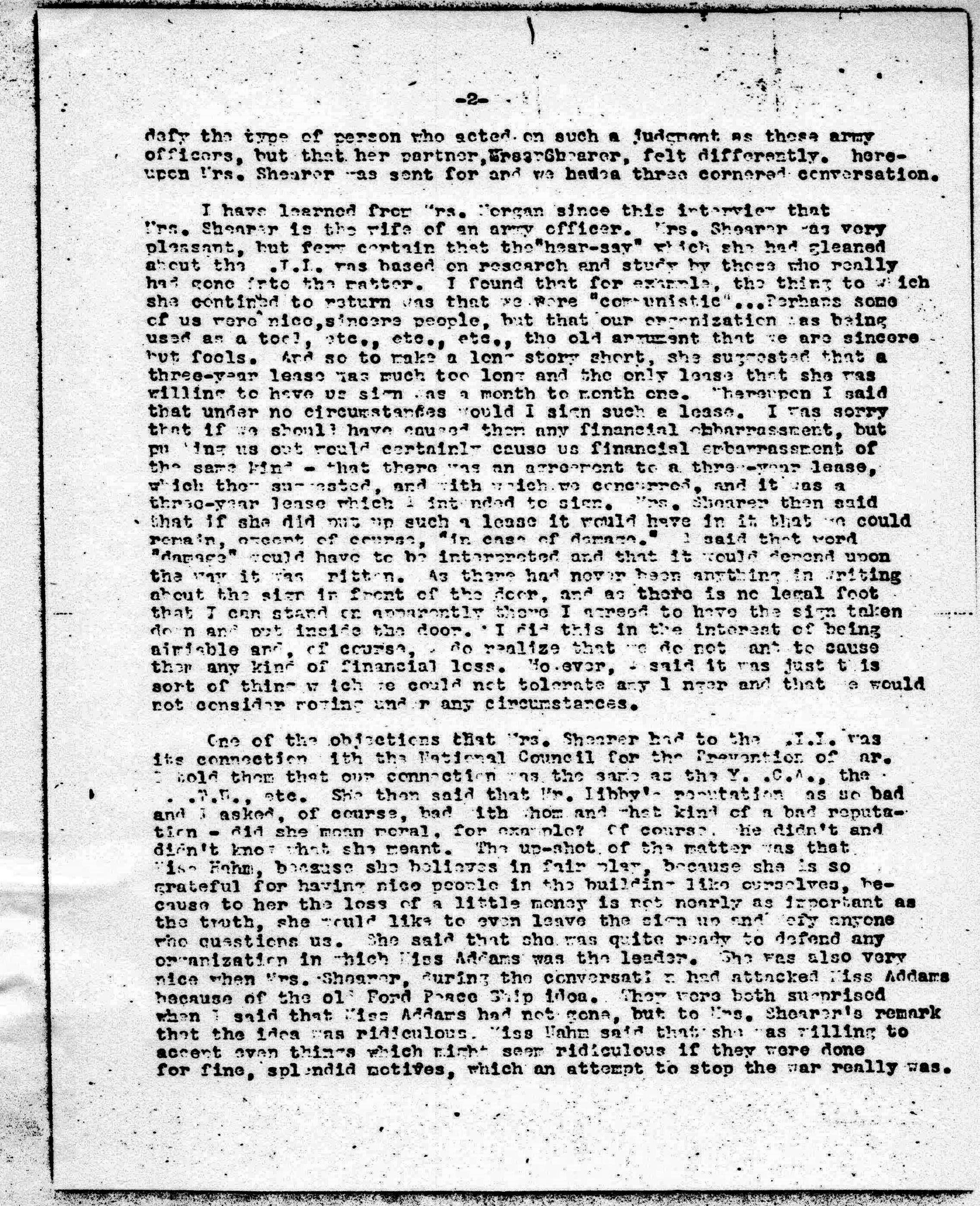 One of the objections that Mrs. Shearer had to the [W.I.L.] was its connection with the National Council for the Prevention of War. I told them that our connection was the same as the [Y.W.C.A.], the [illegible], etc. She then said that Mr. Libby's reputation [was] so bad and I asked, of course, bad with whom and what kind of a bad reputation -- did she mean moral, for example? Of course [she?] didn't and didn't know what she meant. The up-shot of the matter was that Miss Hahm, because she believes in fair play, because she is so grateful for having nice people in the building like ourselves, because to her the loss of a little money is not nearly as important as the truth, she would like to even leave the sign up and defy anyone who questions us. She said that she was quite ready to defend any organization in which Miss Addams was the leader. She was also very nice when Mrs. Shearer, during the conversation had attacked Miss Addams because of the old Ford Peace Ship idea. They were both surprised when I said that Miss Addams had not gone, but to Mrs. Shearer's remark that the idea was ridiculous. Miss Hahm said that she was willing to accept even things which might seem ridiculous if they were done for fine, splendid motives, which an attempt to stop the war really was. [page 3]