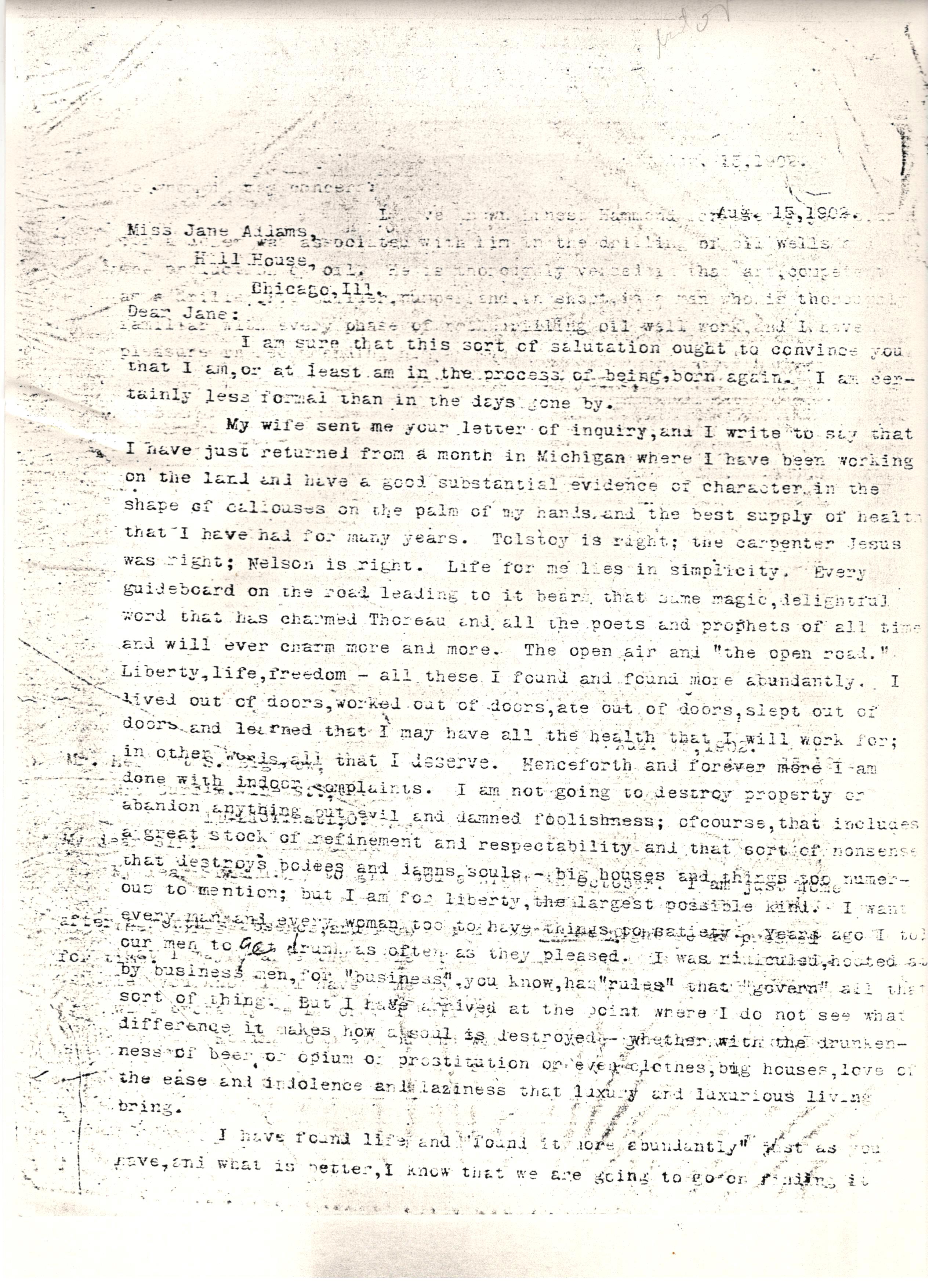 My wife sent me your letter of inquiry, and I write to say that I have just returned from a month in Michigan where I have been working on the land and have a good substantial evidence of character in the shape of callouses on the palm of my hands and the best supply of health that I have had for many years. Tolstoy is right; the carpenter Jesus was right; Nelson is right. Life for me lies in simplicity. Every guideboard on the road leading to it bears that same magic, delightful word that has charmed Thoreau and all the poets and prophets of all time and will ever charm more and more. The open air and "the open road." Liberty, life, freedom--all these I found and found more abundantly. I lived out of doors, worked out of doors, ate out of doors, slept out of doors and learned that I may have all the health that I will work for; in other words, all that I deserve. Henceforth and forever more I am done with indoor complaints. I am not going to destroy property or abandon anything but evil and damned foolishness; of course, that includes a great stock of refinement and respectability and that sort of nonsense that destroys bodies and damns souls--big houses and things too numerous to mention; but I am for liberty, the largest possible kind. I want every man and every woman too, to have things to satiety. Years ago I told our men to get drunk as often as they pleased. I was ridiculed, hooted at by business men, for "business", you know, has "rules" that "govern" all that sort of thing. But I have arrived at the point where I do not see what difference it makes how a soul is destroyed--whether with the drunkenness of beer or opium or prostitution or even clothes, big houses, love of the ease and indolence and laziness that luxury and luxurious living bring.