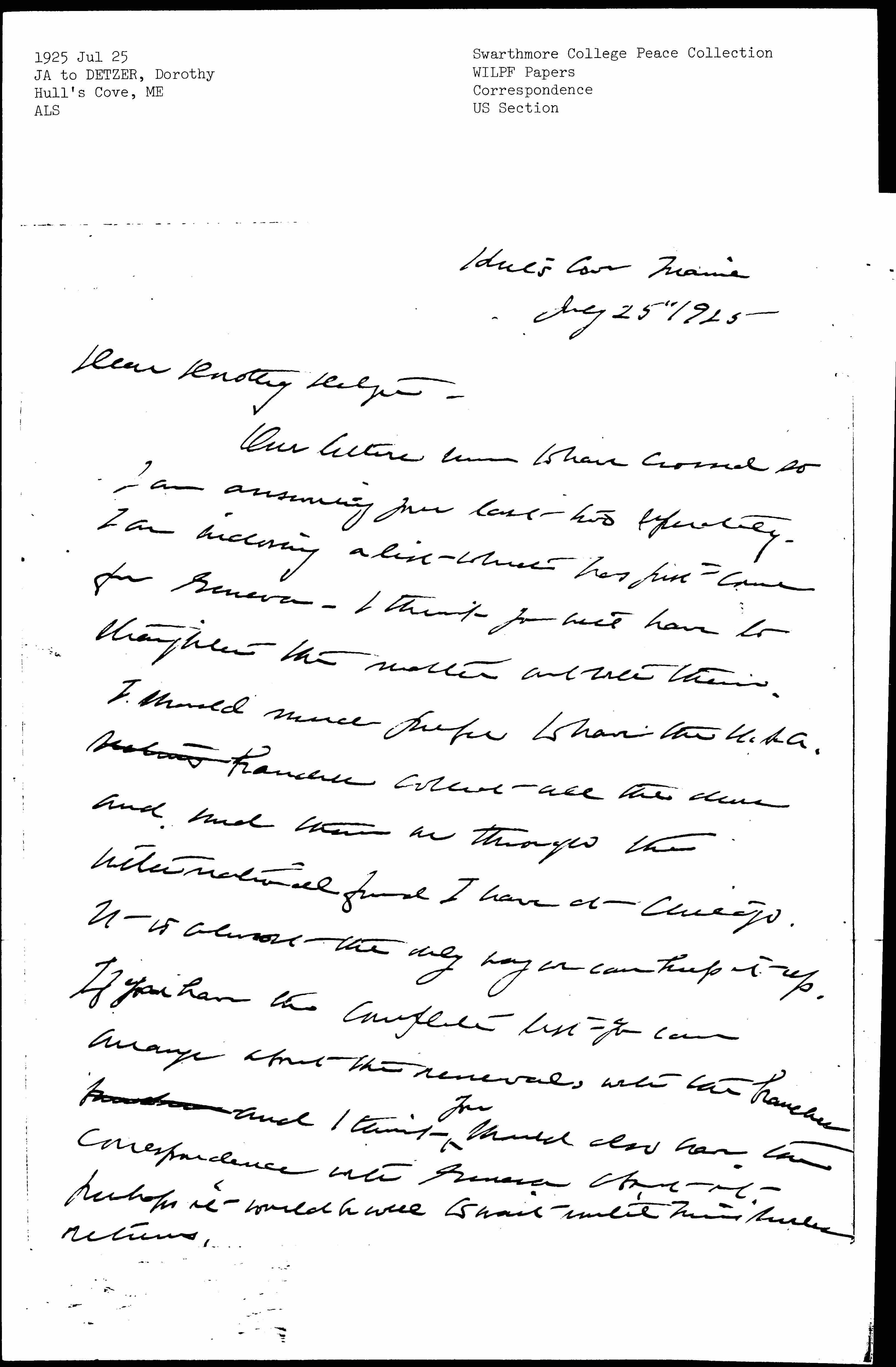 Our letters seem to have crossed so I am answering your last two separately. I am [enclosing] a list which has just come from Geneva -- I think you will have to straighten the matter out with them. I should much prefer to have the U.S.A. sections branches collect all the dues and send them on through the international fund I have at Chicago. It is almost the only way we can keep it up. If you have the complete list you can arrange about the renewals with the branches [illegible] and I think ↑you↓ should also have the correspondence with Geneva about it, perhaps it would be well to wait until Miss Surles returns. [page 2]