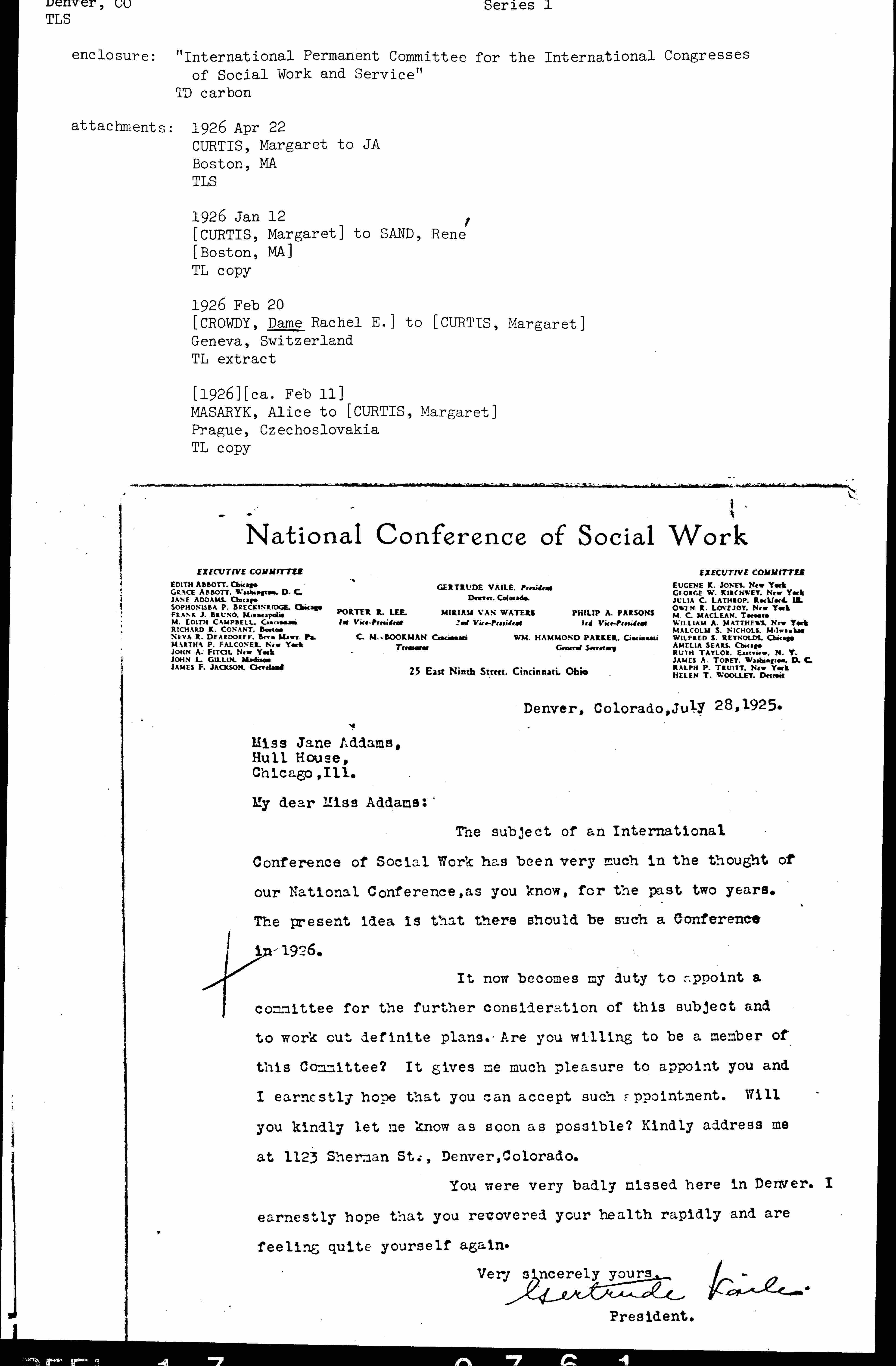The subject of an International Conference of Social Work has been very much in the thought of our National Conference, as you know, for the past two years. The present idea is that there should be such a Conference in 1926.