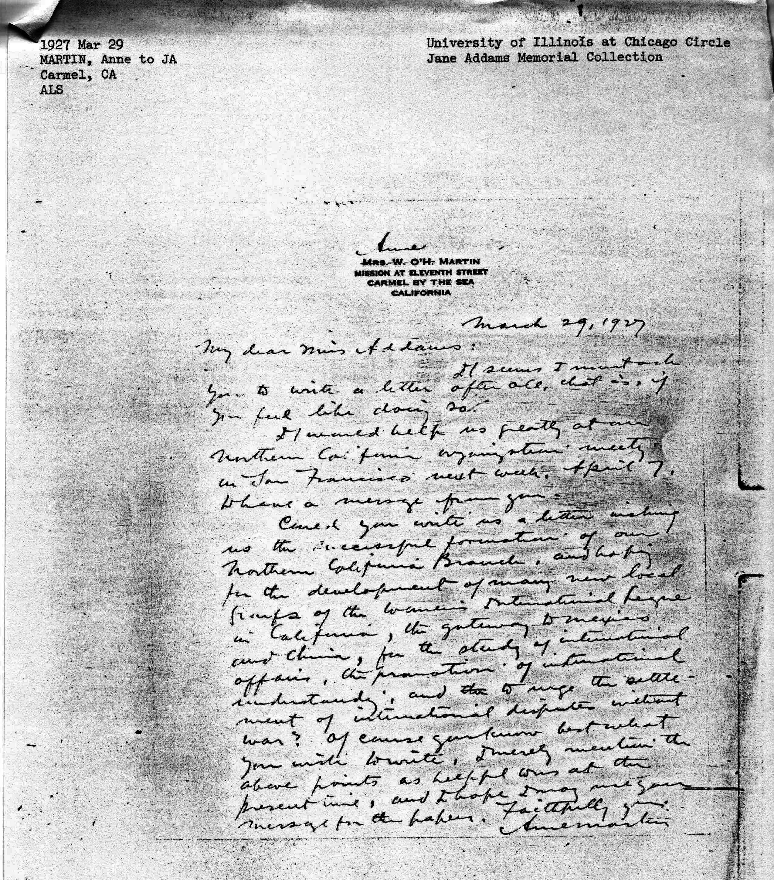 Can you write us a letter wishing us the successful formation of our Northern California Branch, and hoping for the development of many new local groups of the Women's International League in California, the gateway to Mexico and China, for the study of international affairs, the promotion of international understanding, and the to urge the settlement of international disputes without war? Of course you know best what you wish to write, I merely mention the above points as helpful ones at the present time, and I hope I may [use] your message for the papers. Faithfully yours,