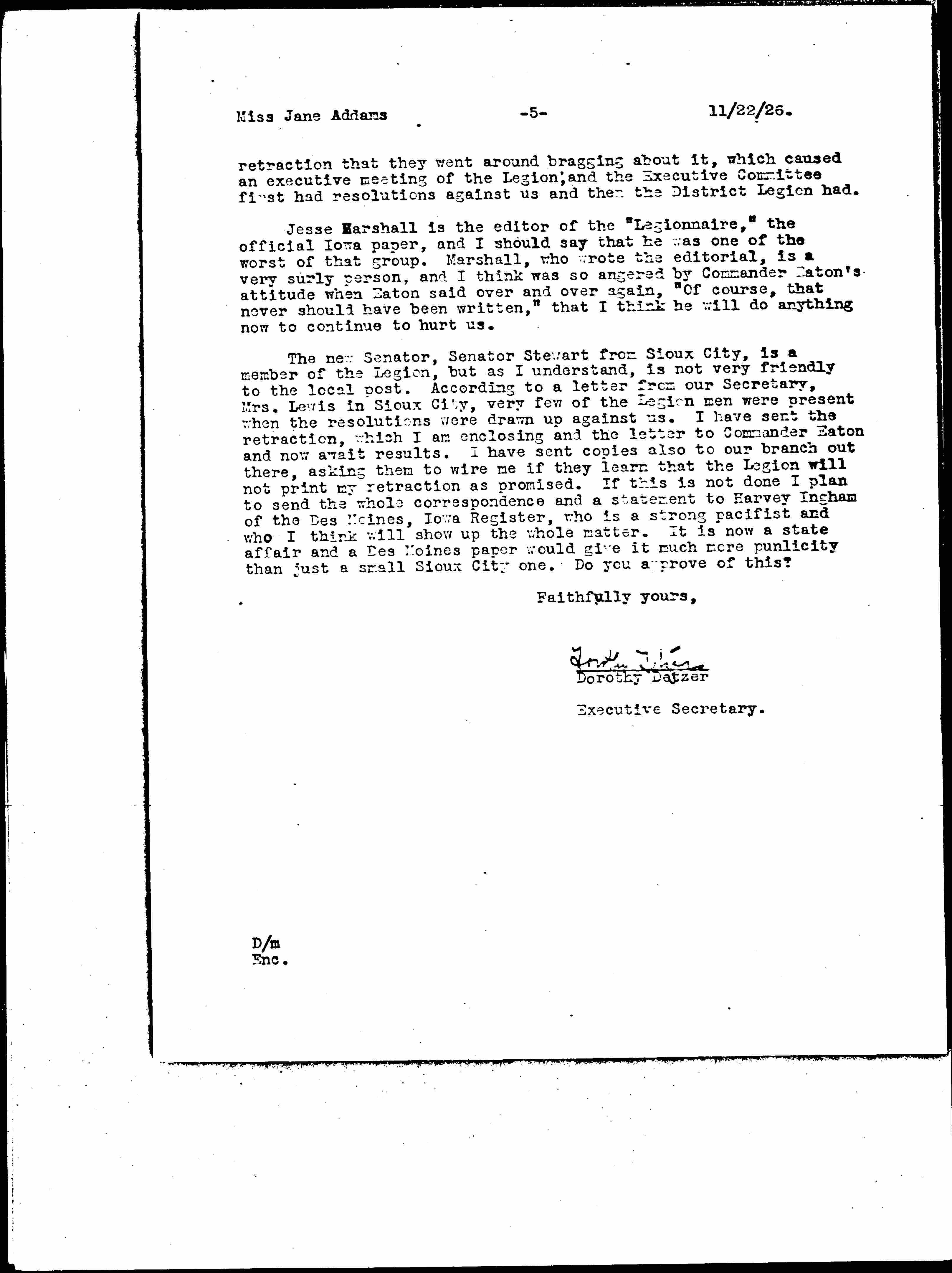 The new Senator, Senator Stewart from Sioux City, is a member of the Legion, but as I understand, is not very friendly to the local post. According to a letter from our Secretary, Mrs. Lewis in Sioux City, very few of the Legion men were present when the resolutions were drawn up against us. I have sent the retraction, which I am enclosing and the letter to Commander Eaton and now await results. I have sent copies also to our branch out there, asking them to wire me if they learn that the Legion will not print my retraction as promised. If this is not done I plan to send the whole correspondence and a statement to Harvey Ingham of the Des Moines, Iowa Register, who is a strong pacifist and who I think will show up the whole matter. It is now a state affair and a Des Moines paper would give it much more publicity than just a small Sioux City one. Do you approve of this?