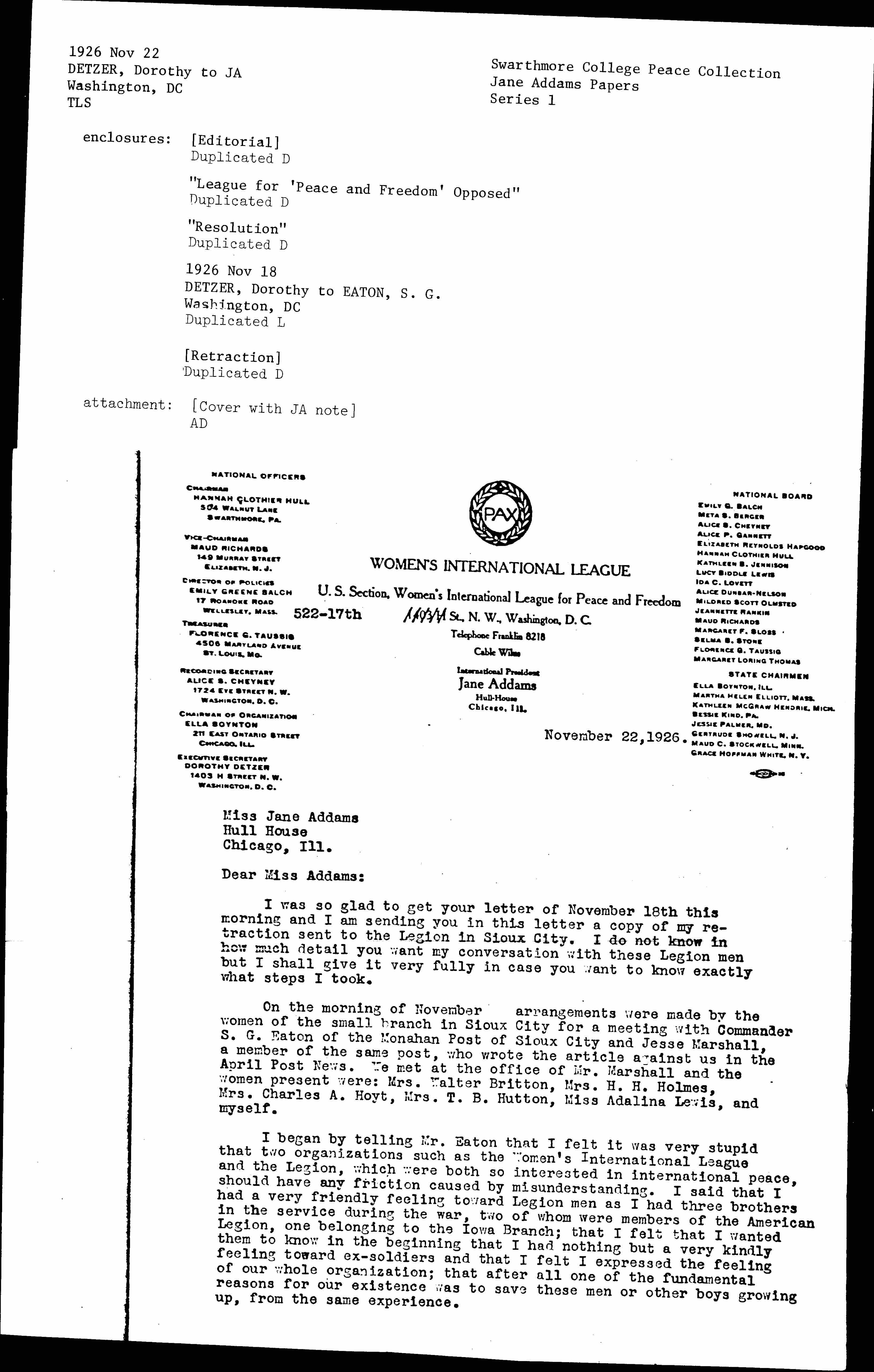 I began by telling Mr. Eaton that I felt it was very stupid that two organizations such as the Women's International League and the Legion, which were both so interested in international peace, should have any friction caused by misunderstanding. I said that I had a very friendly feeling toward Legion men as I had three brothers in the service during the war, two of whom were members of the American Legion, one belonging to the Iowa Branch; that I felt that I wanted them to know in the beginning that I had nothing but a very kindly feeling toward ex-soldiers and that I felt I expressed the feeling of our whole organization; that after all one of the fundamental reasons for our existence was to save these men or other boys growing up, from the same experience. [page 2]