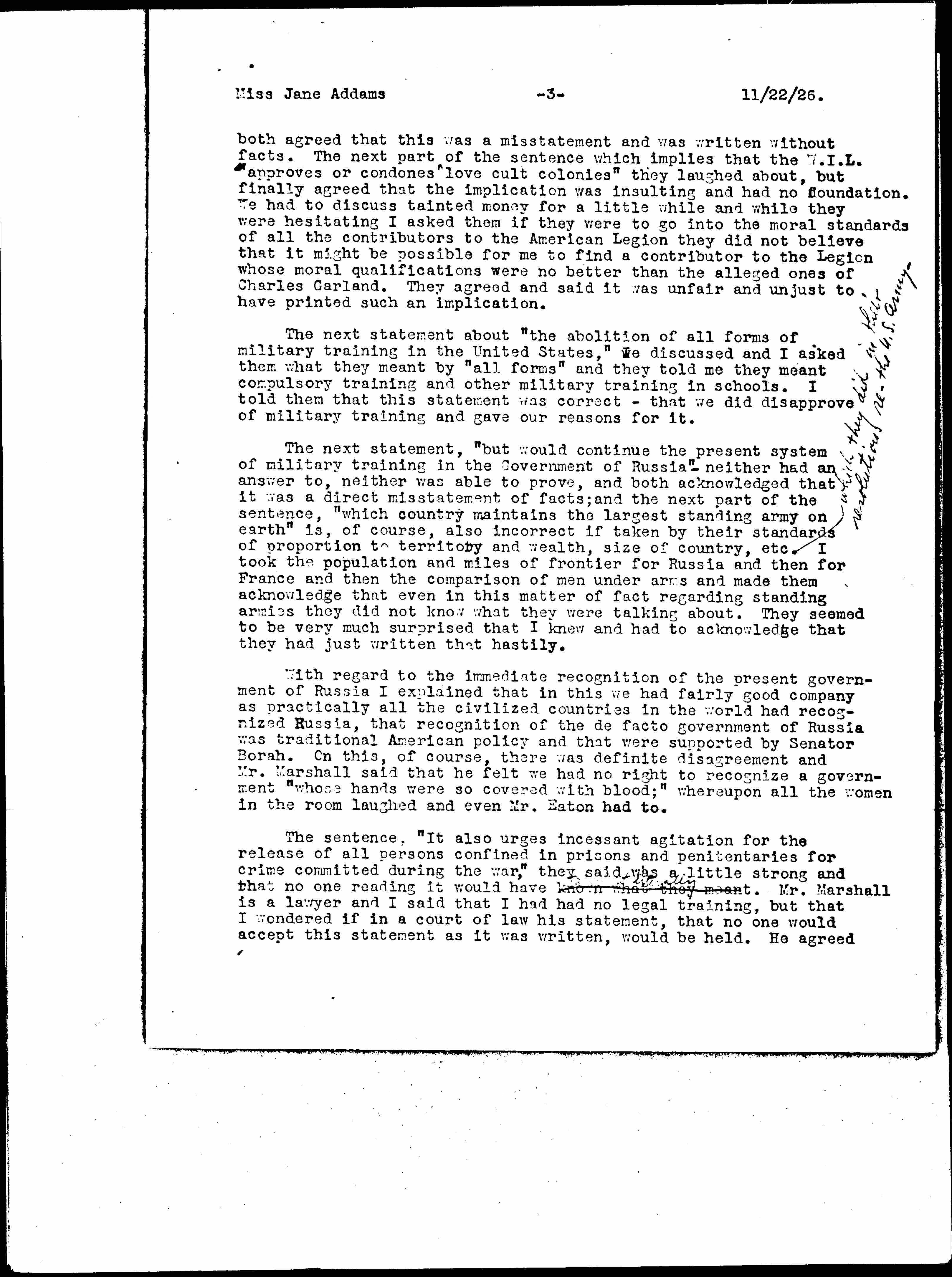 We came to the next sentence, "It is directly affiliated with the Communist Government of Russia ..." and Mr. Eaton said that that was too strong an expression. Mr. Marshall defended it on this ground -- that our international Secretary is Madeleine Doty, that her husband is Roger Baldwin and that on one of the boards on which Roger Baldwin serves is William Z. Foster, who is a Communist; and that, therefore, we were directly affiliated with the Government of Russia. I tried to show him that in that way the W.I.L. was then directly affiliated with the American Legion by proving relationships, etc., etc. Finally they agreed that the sentence should never have been written and was a misstatement.
