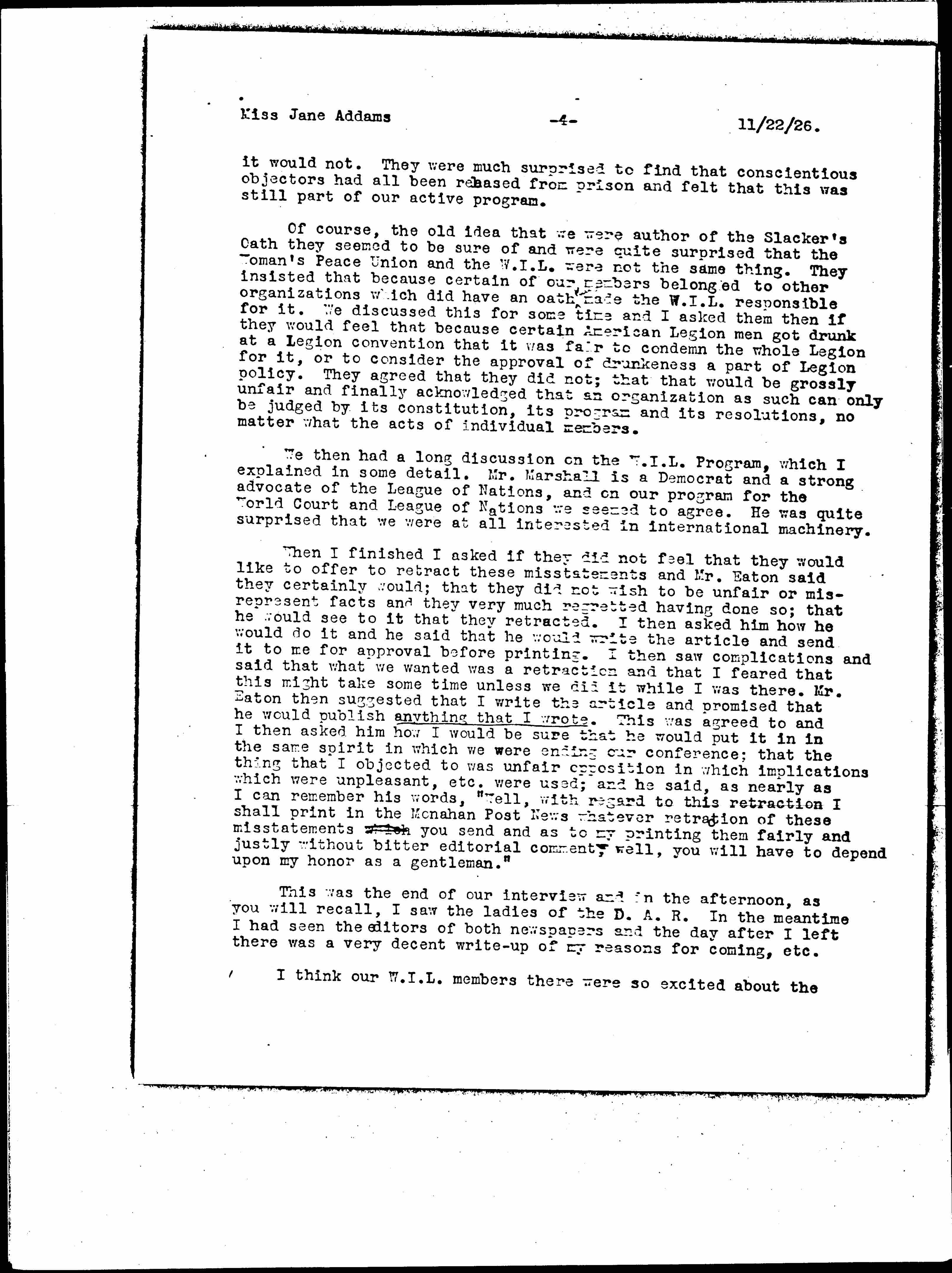Of course, the old idea that we were author of the Slacker's Oath they seemed to be sure of and were quite surprised that the Woman's Peace Union and the W.I.L. were not the same thing. They insisted that because certain of our members belonged to other organizations which did have an oath ↑[then it?]↓ made the W.I.L. responsible for it. We discussed this for some time and I asked them then if they would feel that because certain American Legion men got drunk at a Legion convention that it was fair to condemn the whole Legion for it, or to consider the approval of drunkenness a part of Legion policy. They agreed that they did not; that that would be grossly unfair and finally acknowledged that an organization as such can only be judged by its constitution, its program and its resolutions, no matter what the acts of individual members.