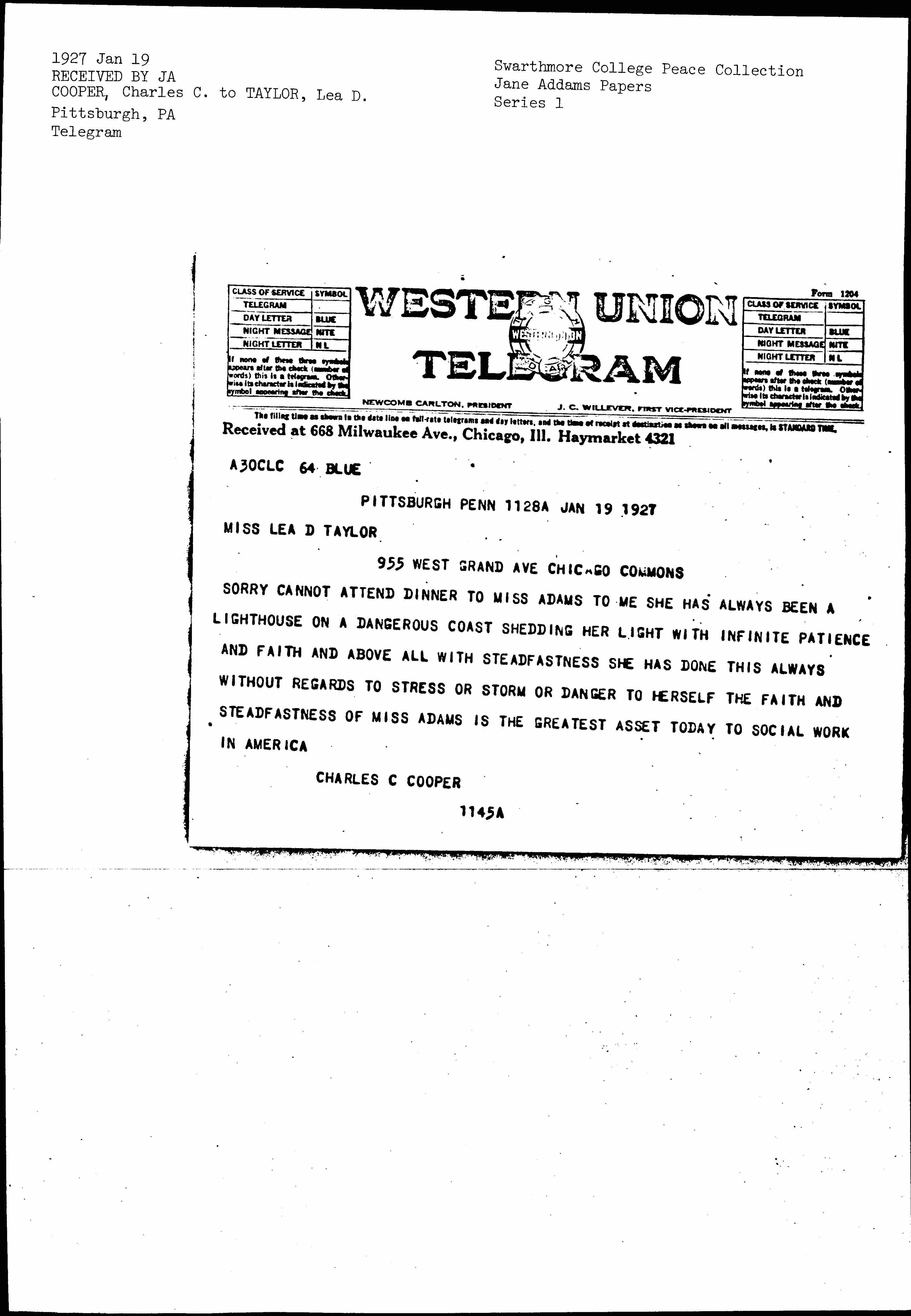 SORRY CANNOT ATTEND DINNER TO MISS [ADDAMS] TO ME SHE HAS ALWAYS BEEN A LIGHTHOUSE ON A DANGEROUS COAST SHEDDING HER LIGHT WITH INFINITE PATIENCE AND FAITH AND ABOVE ALL WITH STEADFASTNESS SHE HAS DONE THIS ALWAYS WITHOUT REGARDS TO STRESS OR STORM OR DANGER TO HERSELF THE FAITH AND STEADFASTNESS OF MISS [ADDAMS] IS THE GREATEST ASSET TODAY TO SOCIAL WORK IN AMERICA