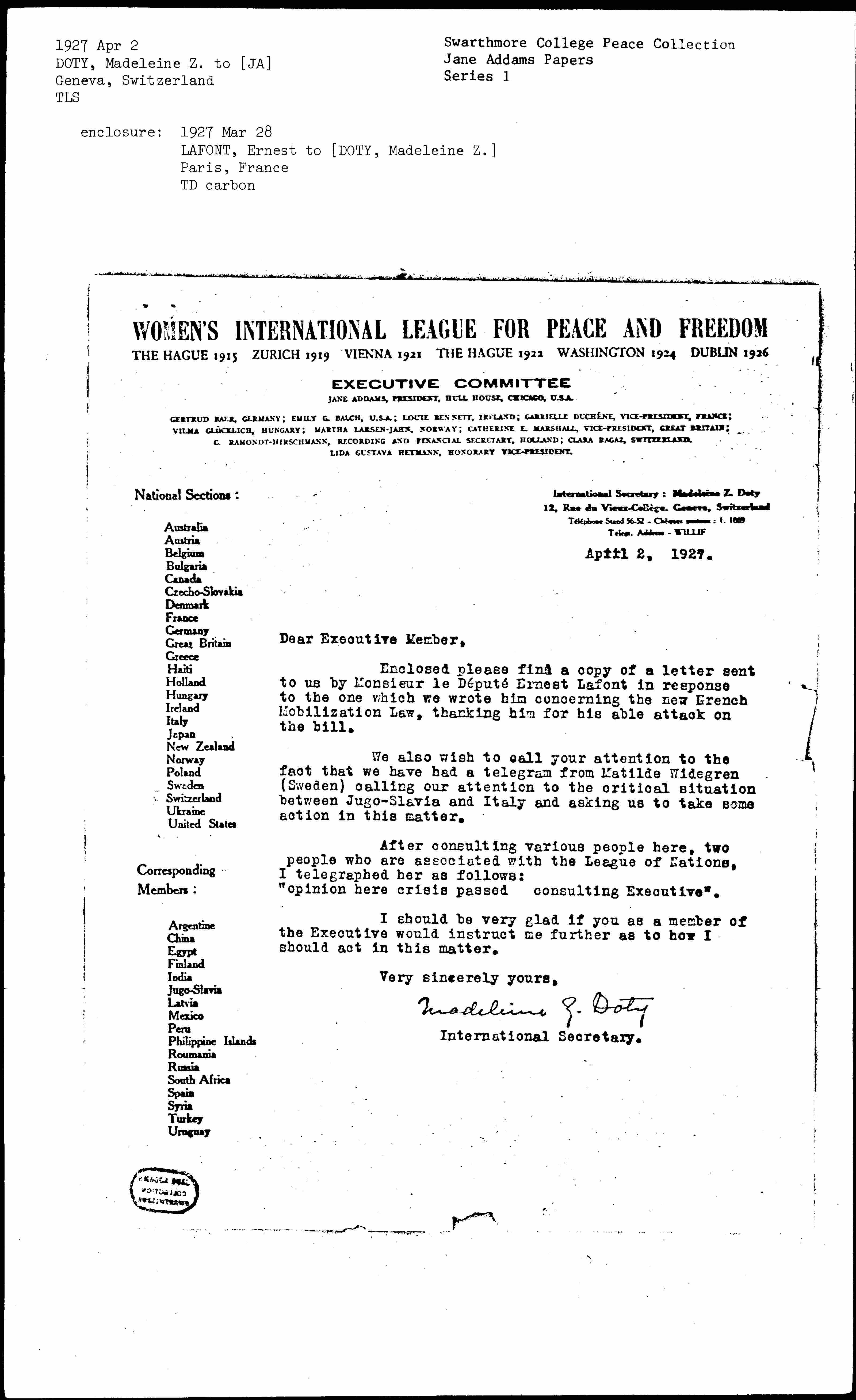 Enclosed please find a copy of a letter sent to us by Monsieur le Député Ernest Lafont in response to the one which we wrote him concerning the new French Mobilization Law, thanking him for his able attack on the bill.