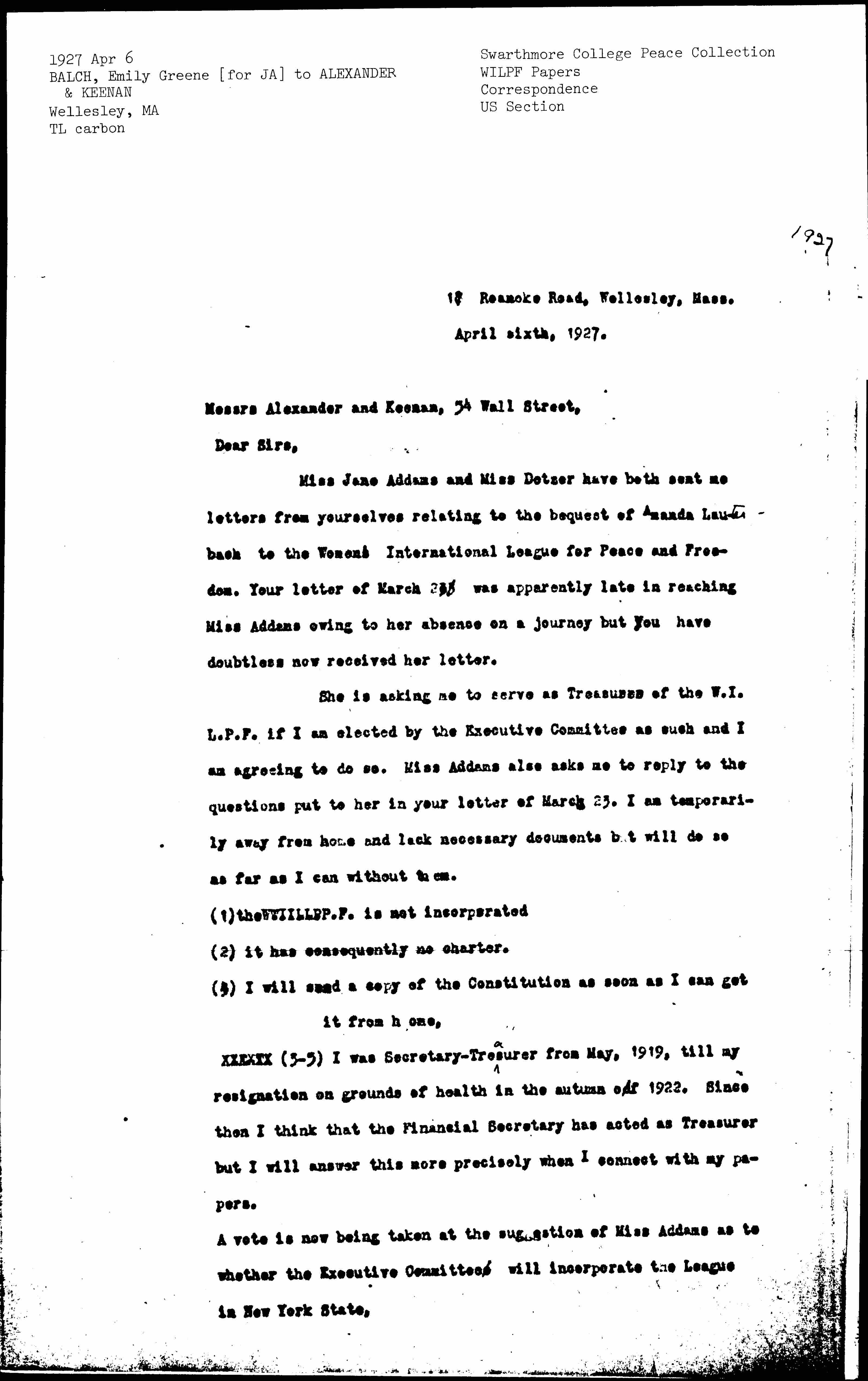 She is asking me to serve as Treasurer of the W.I.L.P.F. if I am elected by the Executive Committee as such and I am agreeing to do so. Miss Addams also asks me to reply to the questions put to her in your letter of March 23. I am temporarily away from home and lack necessary documents but will do so as far as I can without them.