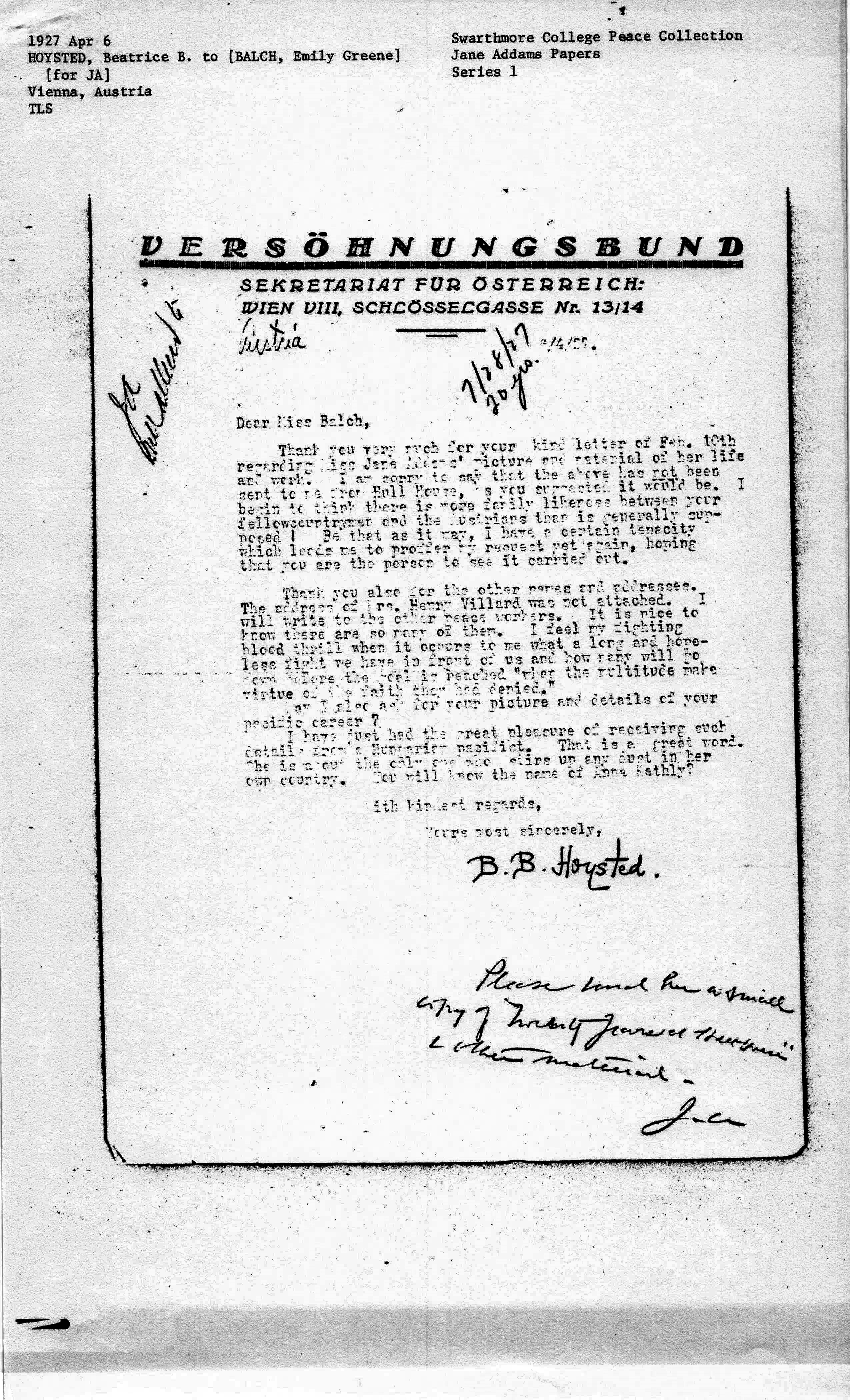 Thank you very much for your kind letter of Feb. 10th regarding Miss Jane Addams' picture and material of her life and work. I am sorry to say that the above has not been sent to me from Hull House, as you suggested it would be. I begin to think there is more family likeness between your fellow countrymen and the Austrians than is generally supposed. Be that as it may, I have a certain tenacity which leads me to proffer my request yet again, hoping that you are the person to see it carried out.