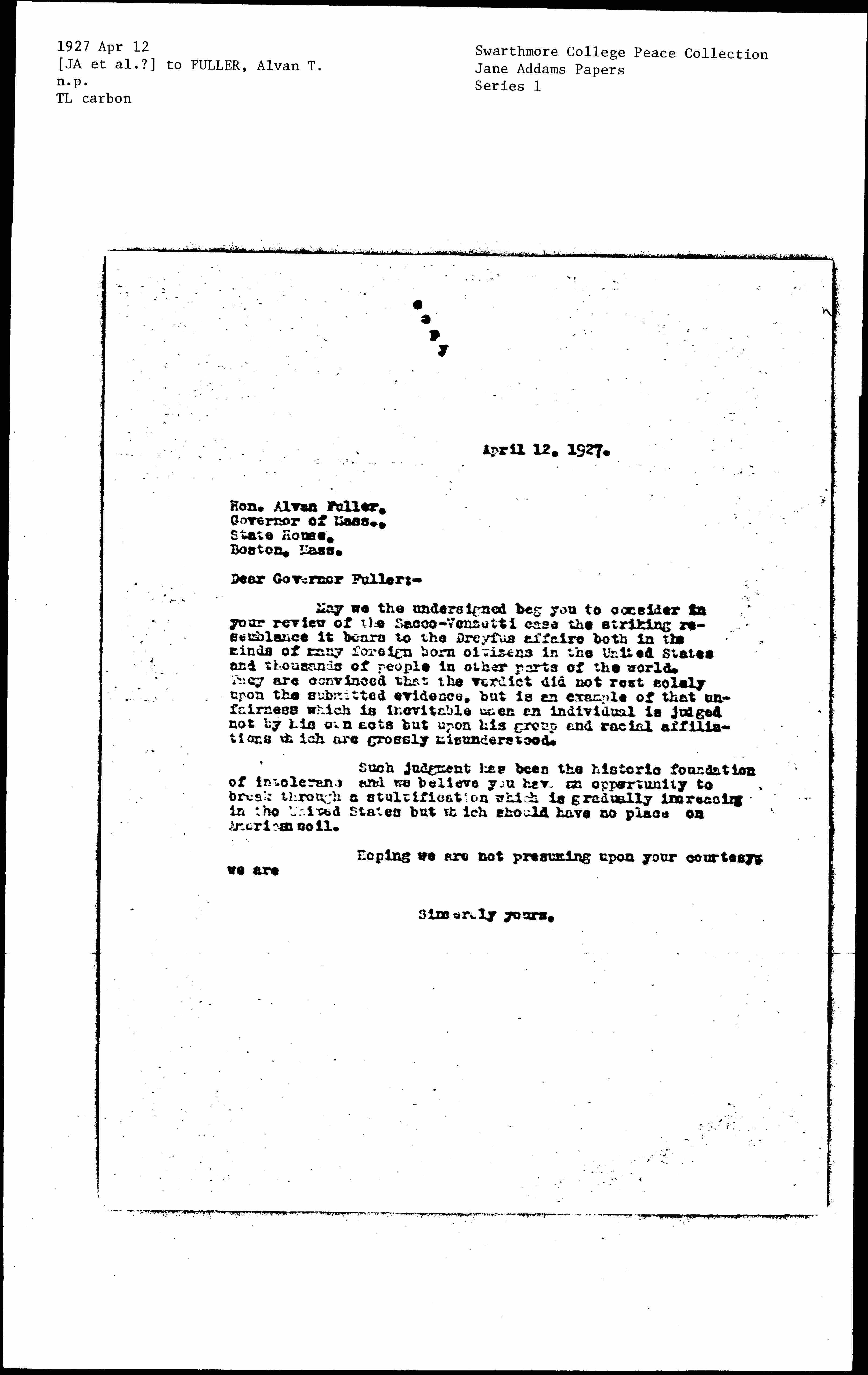 May we the undersigned beg you to consider in your review of the Sacco-[Vanzetti] case the striking resemblance it bears to the Dreyfus [affair] both in the minds of many foreign born citizens in the United States and thousands of people in other parts of the world. They are convinced that the verdict did not rest solely upon the submitted evidence, but is an example of that unfairness which is inevitable when an individual is judged not by his own [acts] but upon his group and racial affiliations which are grossly misunderstood.