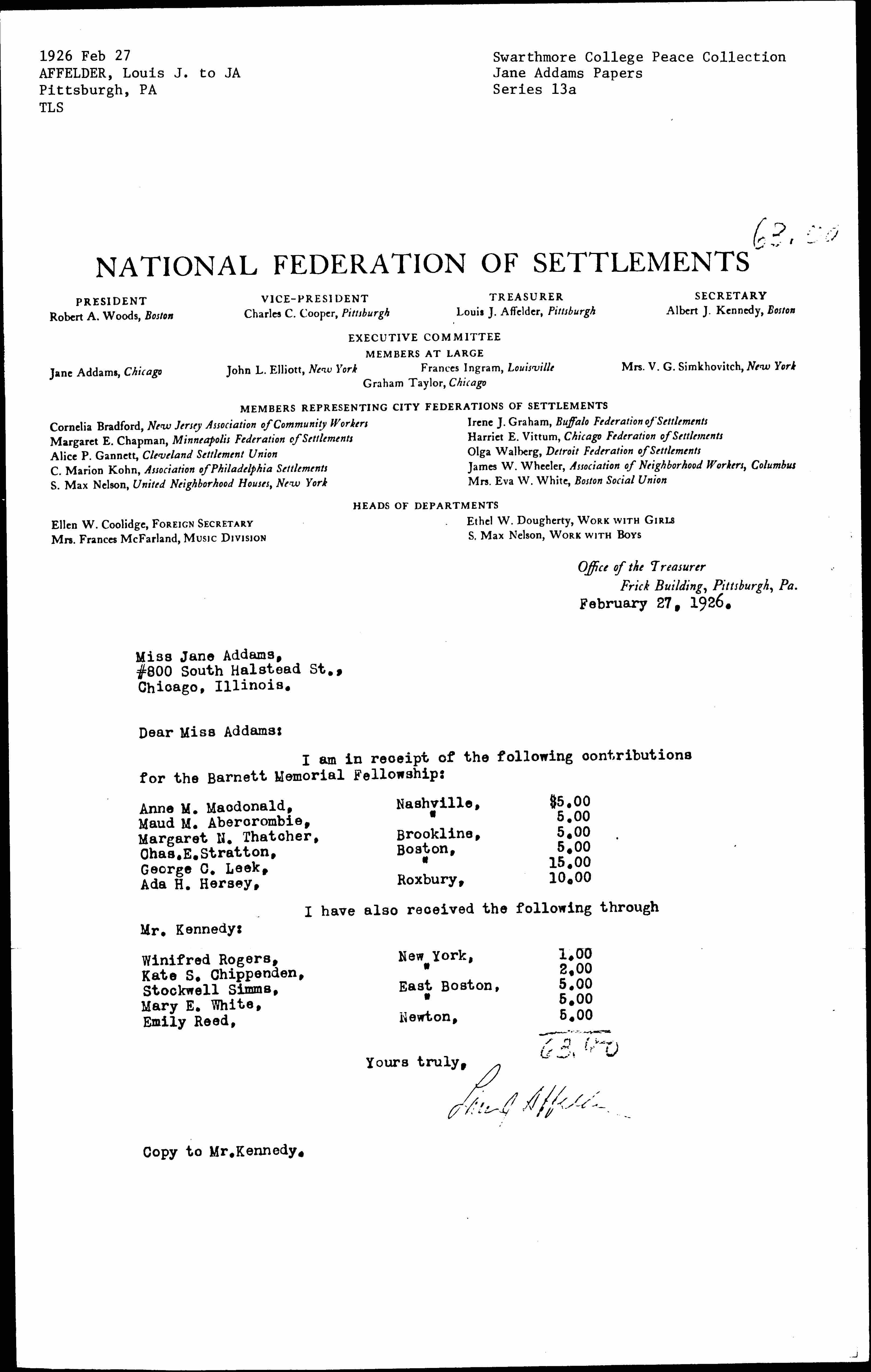 I am in receipt of the following contributions for the Barnett Memorial Fellowship: