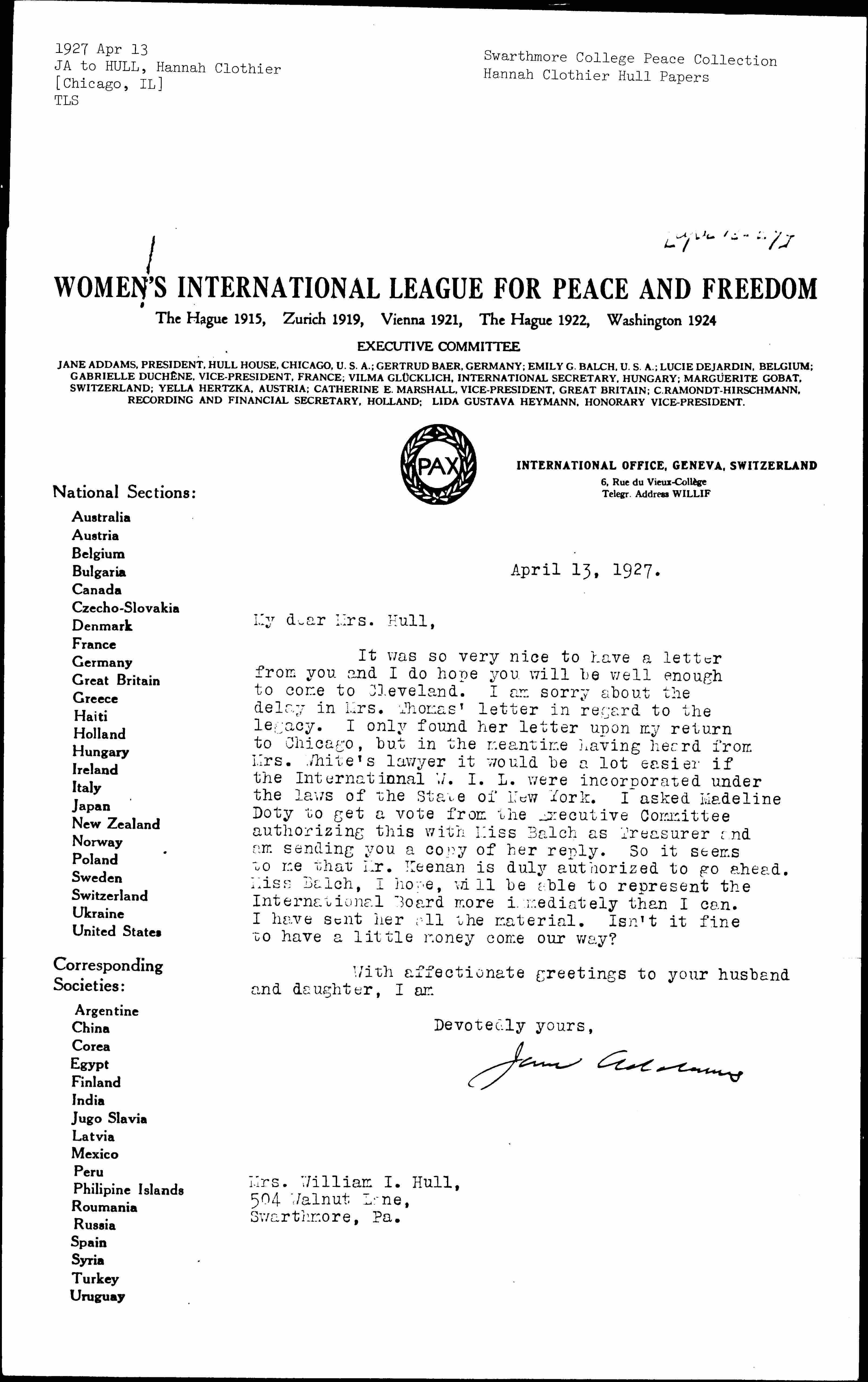 It was so very nice to have a letter from you and I do hope you will be well enough to come to Cleveland. I am sorry about the delay in Mrs. Thomas' letter in regard to the legacy. I only found her letter upon my return to Chicago, but in the meantime having heard from Mrs. White's lawyer it would be a lot easier if the International W.I.L. were incorporated under the laws of the State of New York. I asked [Madeleine] Doty to get a vote from the Executive Committee authorizing this with Miss Balch as Treasurer and am sending you a copy of her reply. So it seems to me that Mr. Keenan is duly authorized to go ahead. Miss Balch, I hope, will be able to represent the International Board more immediately than I can. I have sent her all the material. Isn't it fine to have a little money come our way?