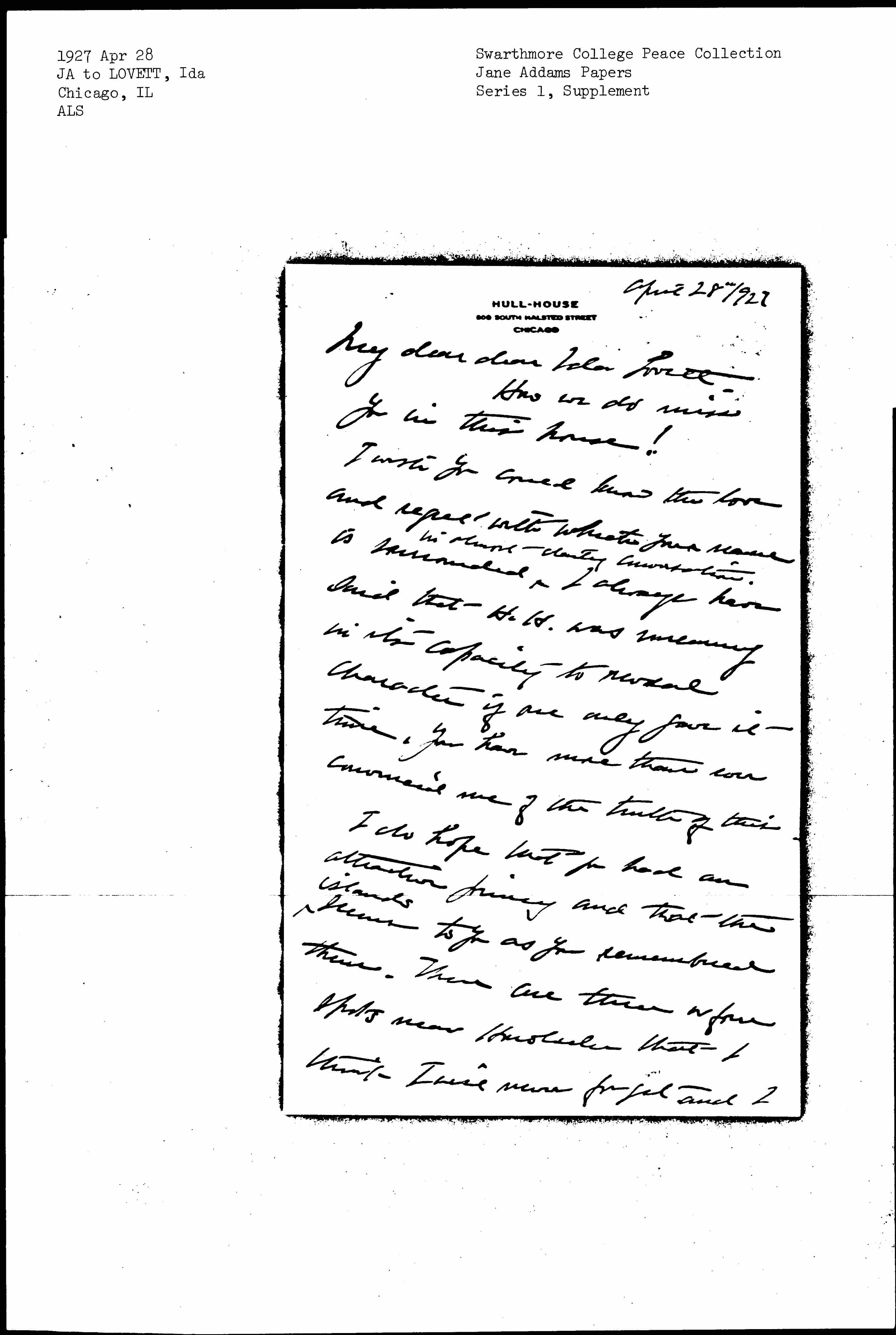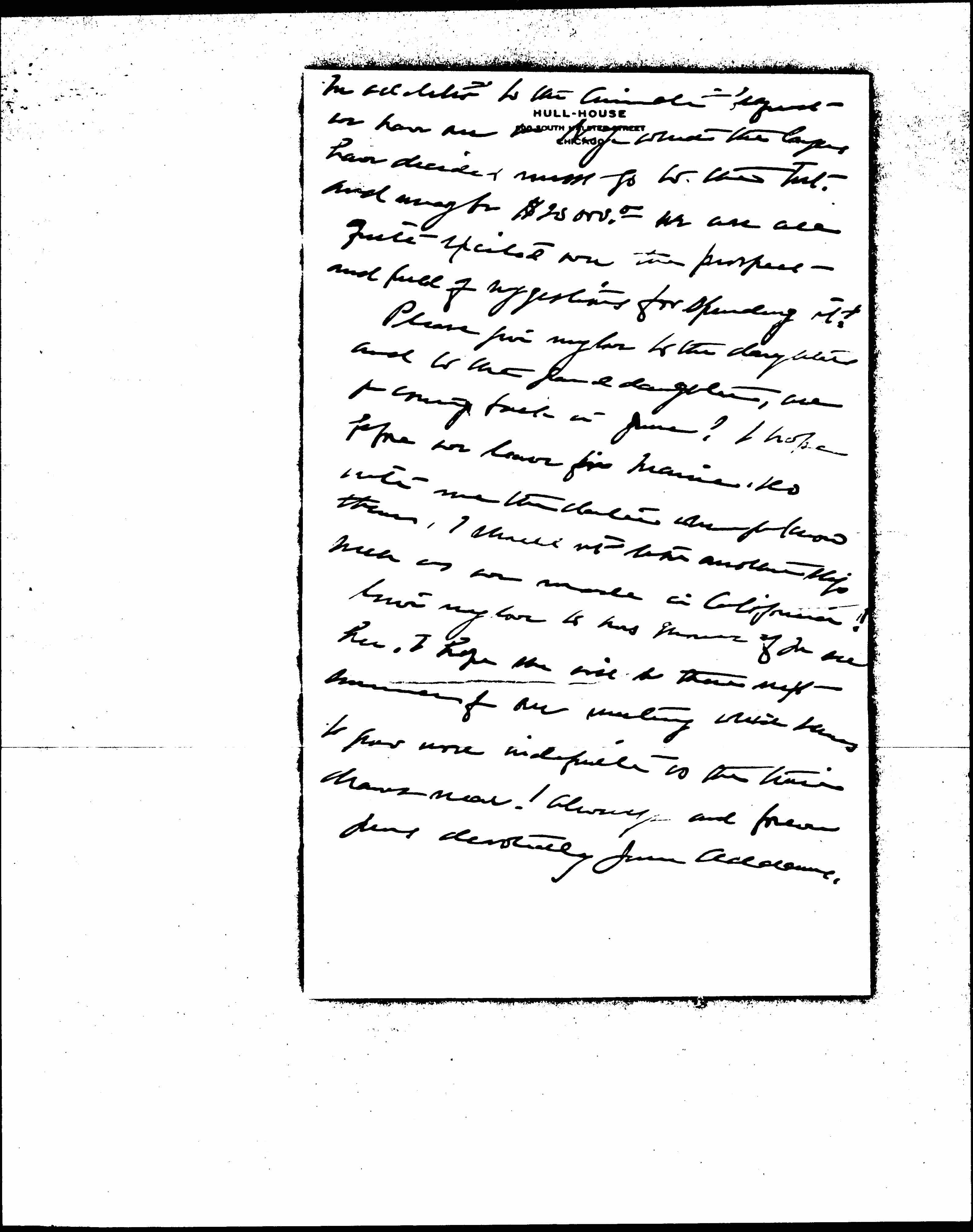 Give my love to Mrs. Graves if you see her. I hope she will be there next summer for our meeting which seems to grow more indefinite as the time draws near! Always and forever yours devotedly Jane Addams.