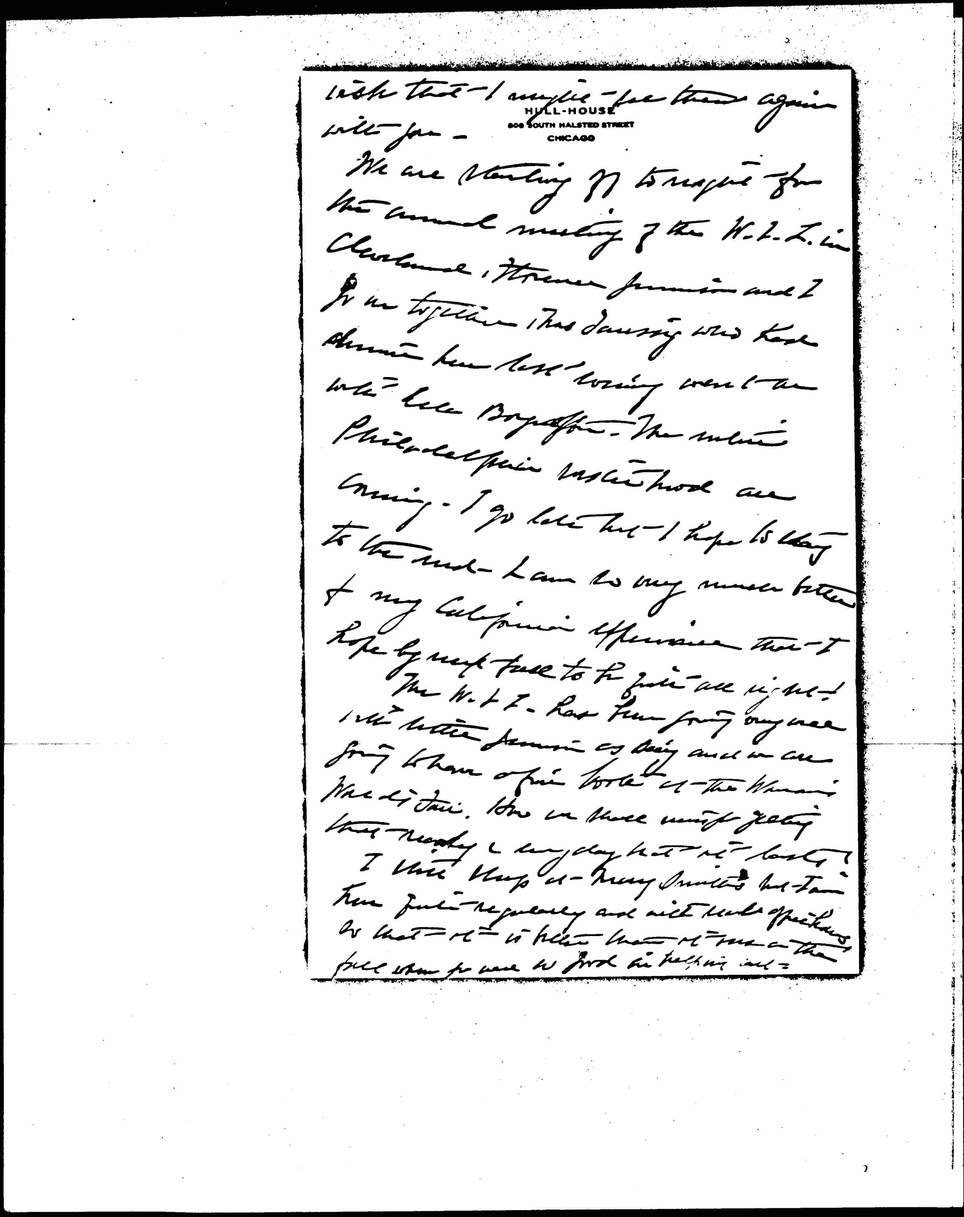 We are starting off tonight for the annual meeting of the W.I.L. in Cleveland. Florence Jennison and I go on together. Mrs Taussig who had dinner here last evening went on with Ella Boynton. The entire Philadelphia sisterhood are coming. I go late but I hope to stay to the end. I am so very much better for my California experience that I hope by next fall to be quite all right!