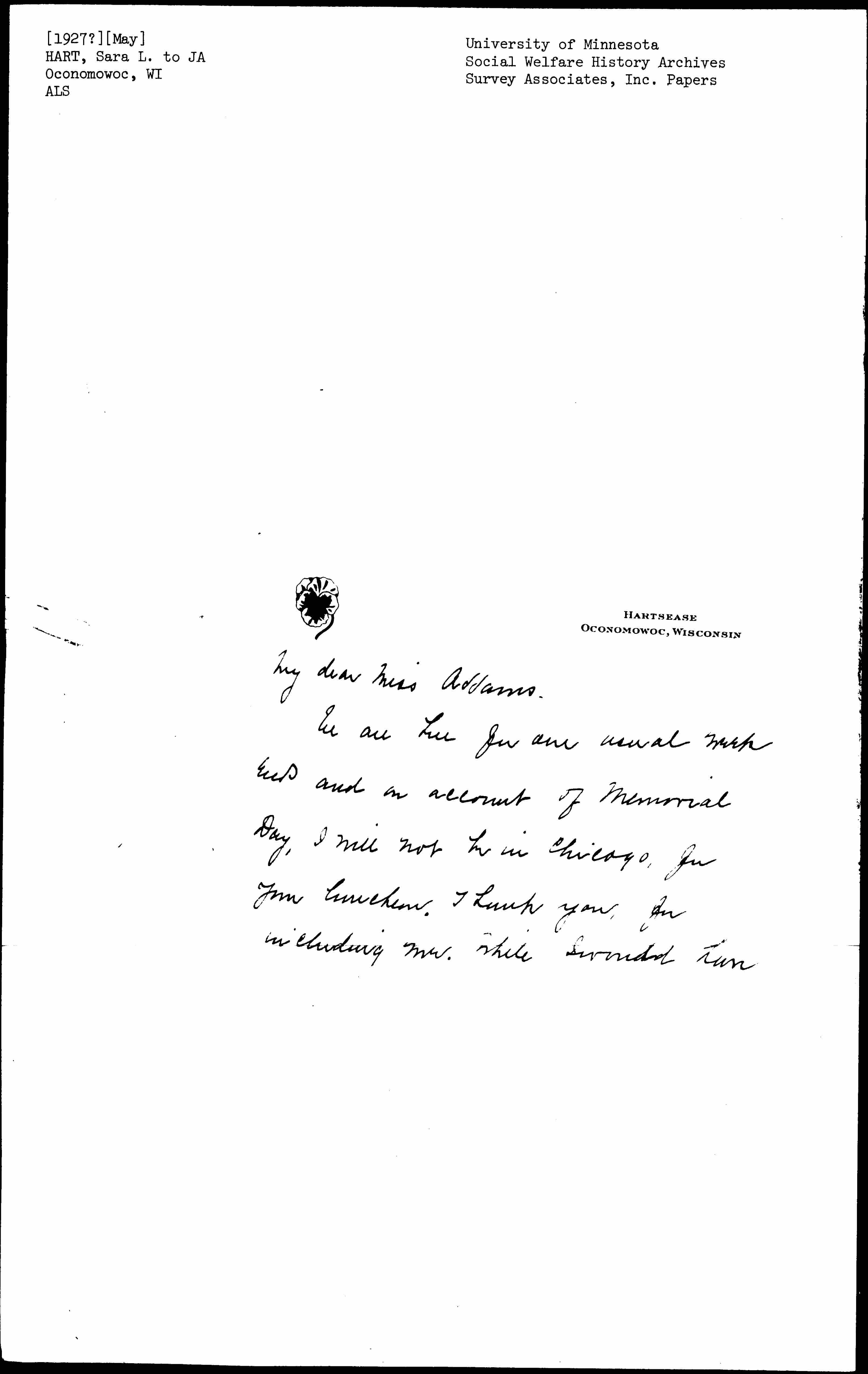 We are here for our usual week end and on account of Memorial Day, I will not be in Chicago, for your luncheon. I thank you, for including me. While I would have [page 2] enjoyed hearing Mr. Kellogg's report, I regret I must miss the pleasure of being with you.