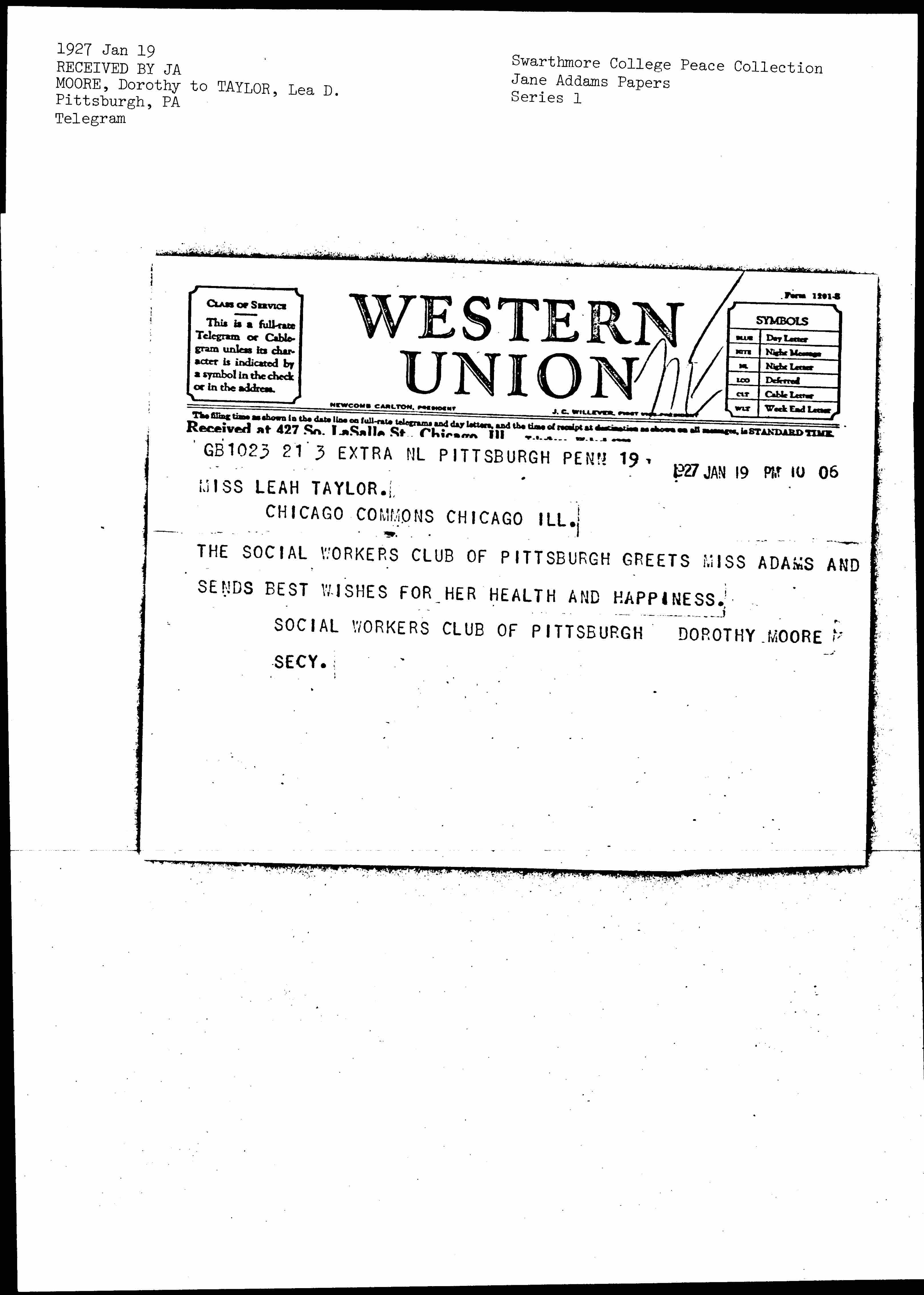 THE SOCIAL WORKERS CLUB OF PITTSBURGH GREETS MISS [ADDAMS] AND SENDS BEST WISHES FOR HER HEALTH AND HAPPINESS.