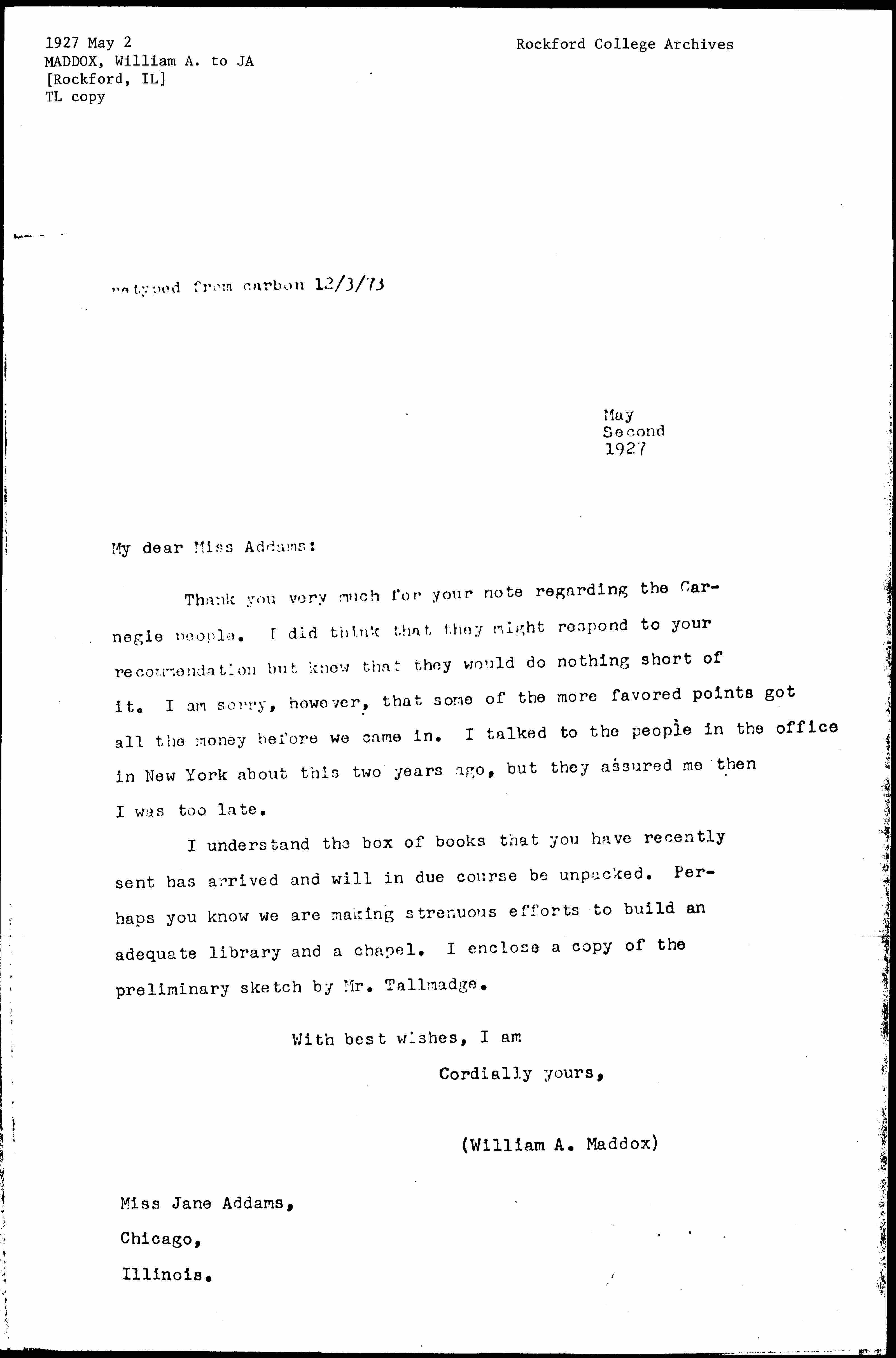 Thank you very much for your note regarding the Carnegie people. I did think that they might respond to your recommendation but knew that they would do nothing short of it. I am sorry, however, that some of the more favored points got all the money before we came in. I talked to the people in the office in New York about this two years ago, but they assured me then I was too late.