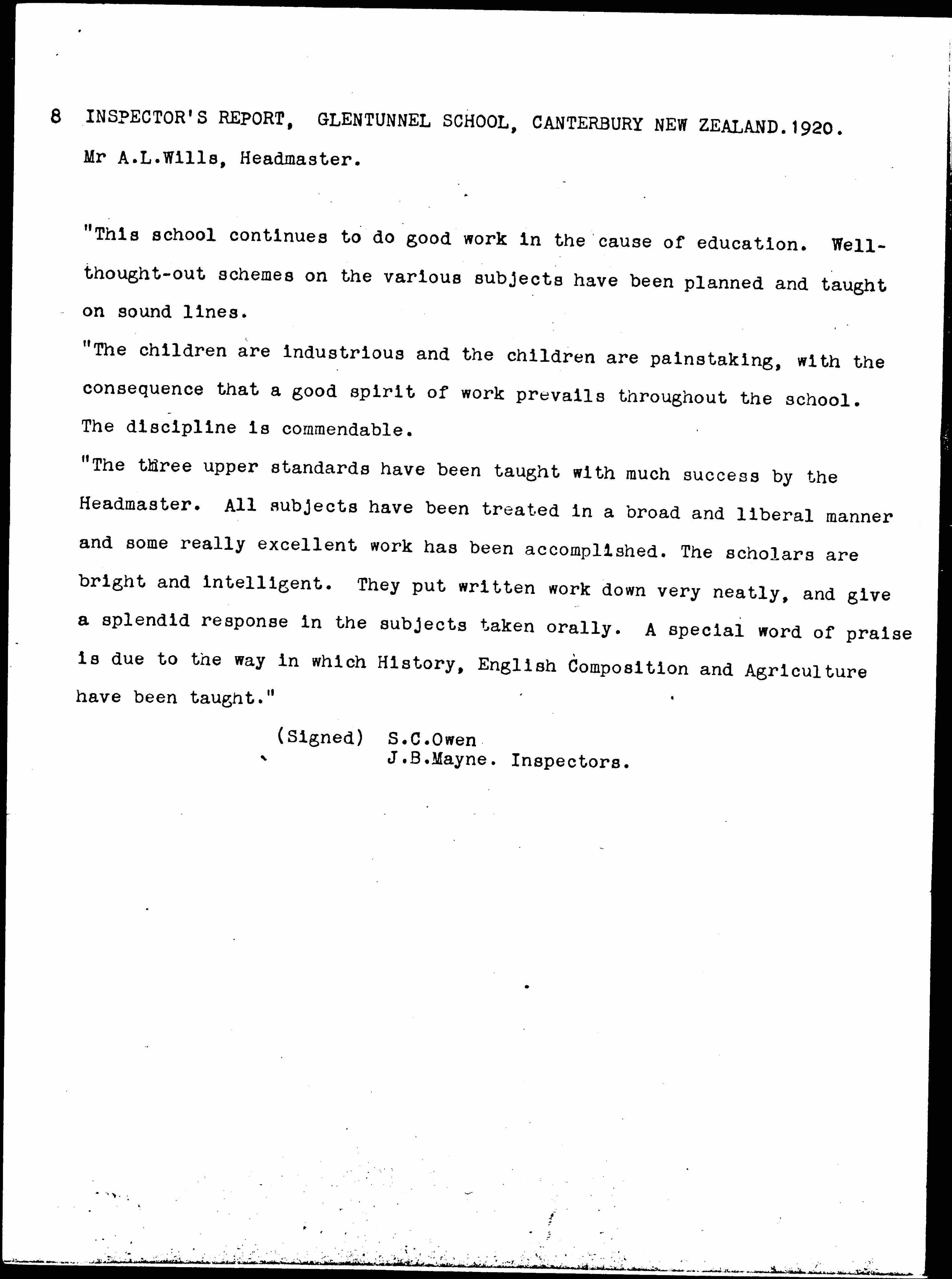 INSPECTOR'S REPORT, GLENTUNNEL SCHOOL, CANTERBURY NEW ZEALAND. 1920.