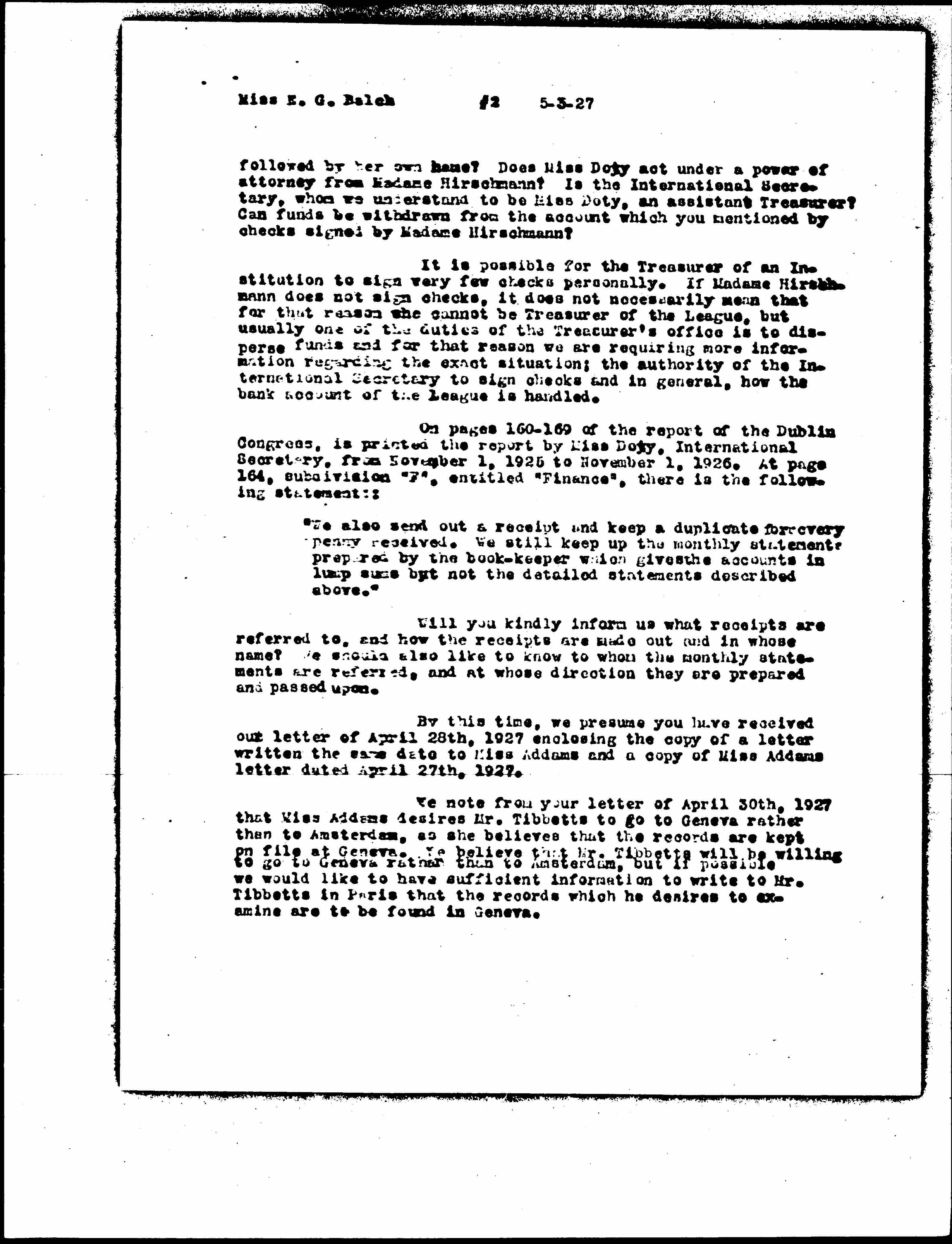 We note from your letter of April 30th, 1927 that Miss Addams desires Mr. Tibbetts to go to Geneva rather than to Amsterdam, as she believes that the records are kept on file at Geneva. We believe that Mr. Tibbetts will be willing to go to Geneva rather than to Amsterdam, but if possible we would like to have sufficient information to write to Mr. Tibbetts in Paris that the records which he desires to examine are to be found in Geneva. [page 3]