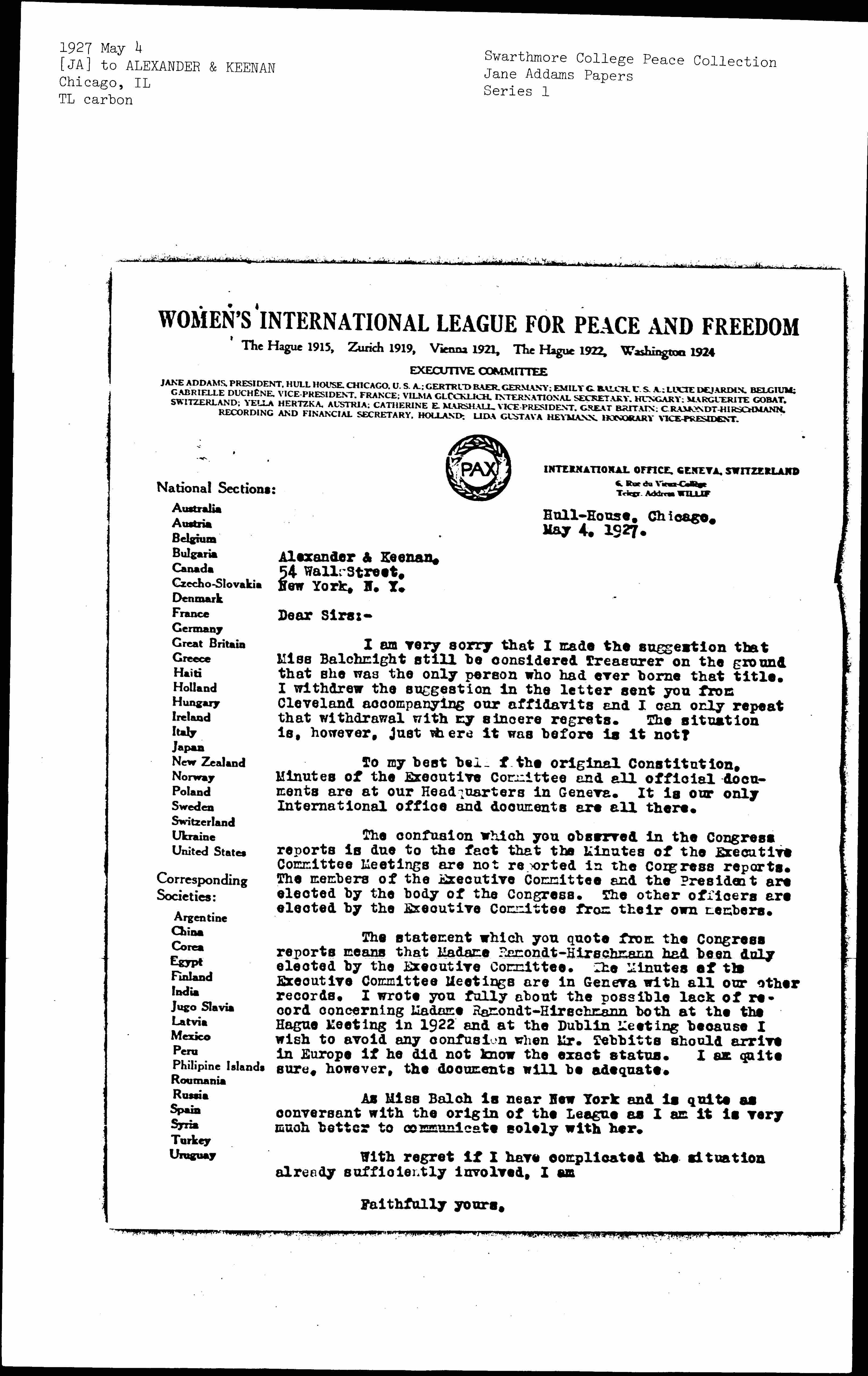 The statement which you quote from the Congress reports means that Madame Ramondt-Hirschmann had been duly elected by the Executive Committee. The Minutes of the Executive Committee Meetings are in Geneva with all our other records. I wrote you fully about the possible lack of record concerning Madame Ramondt-Hirschmann both at The Hague Meeting in 1922 and at the Dublin Meeting because I wish to avoid any confusion when Mr. [Tibbitts] should arrive in Europe if he did not know the exact status. I am quite sure, however, the documents will be adequate.