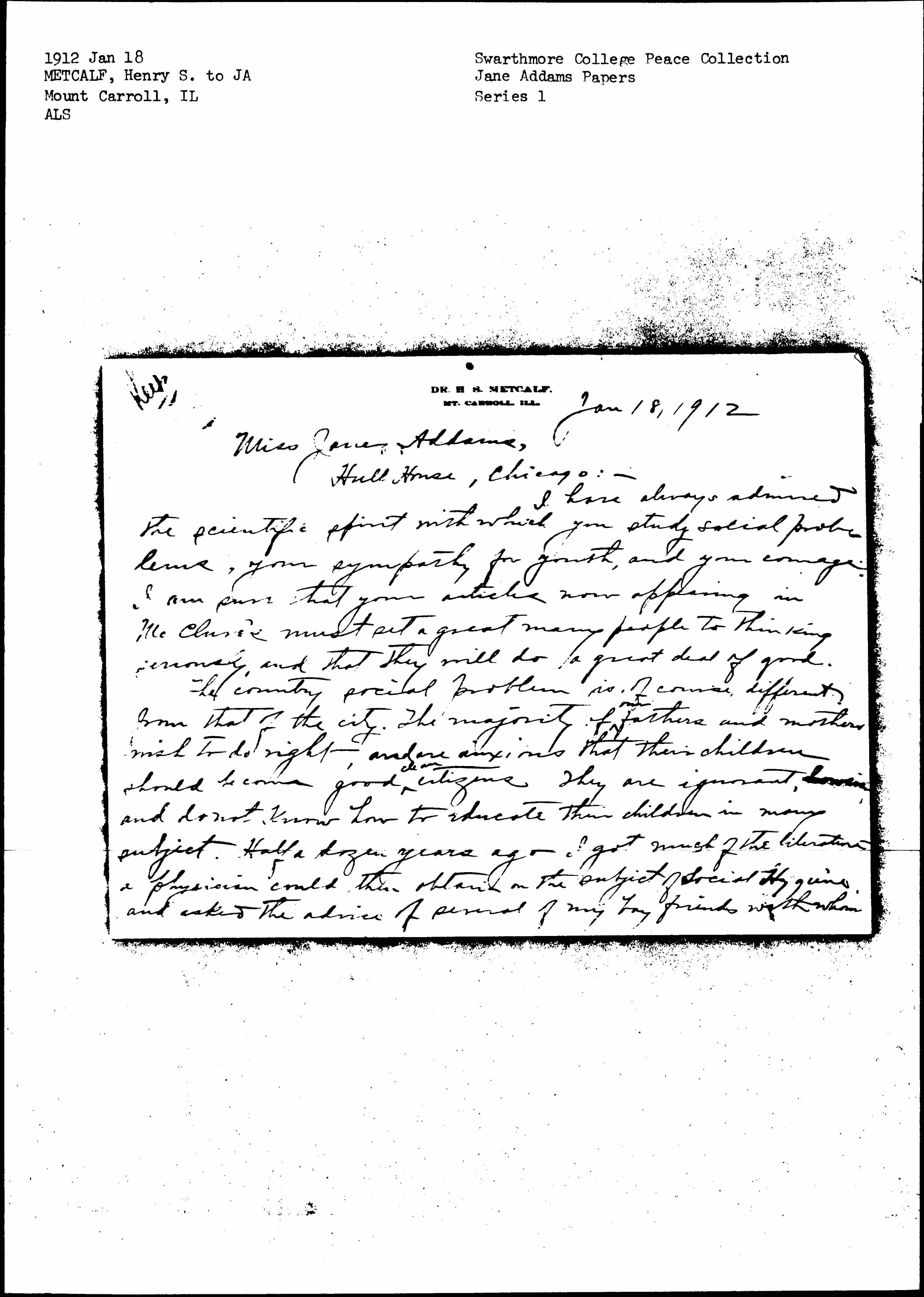 The country social problem is, of course, different from that of the city. The majority of <our> fathers and mothers wish to do right, and are anxious that their children should become good <clean> citizens. They are ignorant, however, and do not know how to educate their children in many subject. Half a dozen years ago I got much of the literature a physician could then obtain on the subject of Social Hygiene and asked the advice of several of my boy friends with whom [page 2] I was intimate socially and as their family doctor. We decided that Dr. [Willson's] University of Penn. address (I have sent you a copy) was the most easily understood <and> was the work of a man of high ideals, and that it would appeal to youth. The young men said, however, that it was too long; for most high school boys of eighteen would perhaps read from pages, but not twelve.
