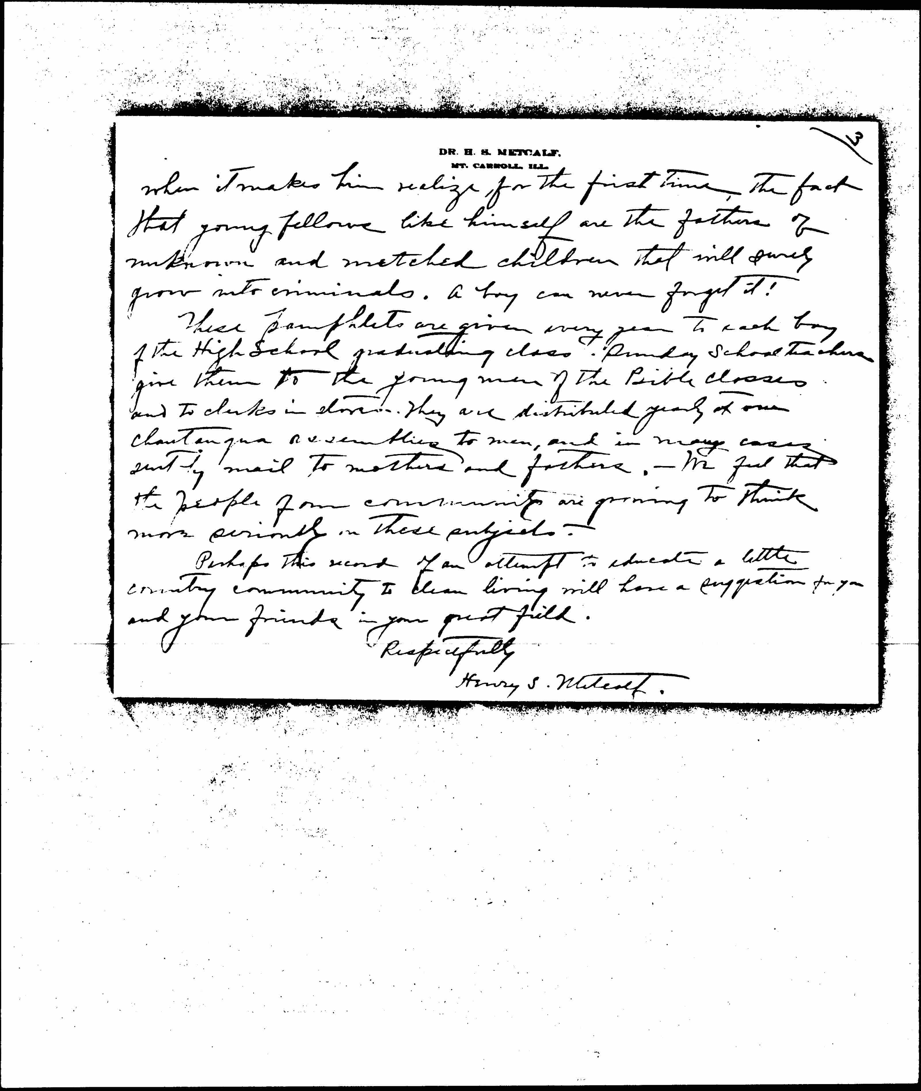 A boy sometimes is wiser than a man and I accepted their opinion, and made an abstract of the lecture which was posted in the covers of the pamphlets. I wrote Mr. [Willson?] of the opinion of the lads and suggested that in still simpler language he recast the article making a folder of four pages and that <he> make still stronger the appeal on page 8, and paragraph on Illegitimate Fatherhood on page 11. The latter deeply impresses even a careless <boy> [page 3] when it makes him realize, for the first time, the fact that young fellows like himself are the fathers of unknown and wretched children that will surely grow into criminals. A boy can never forget it!