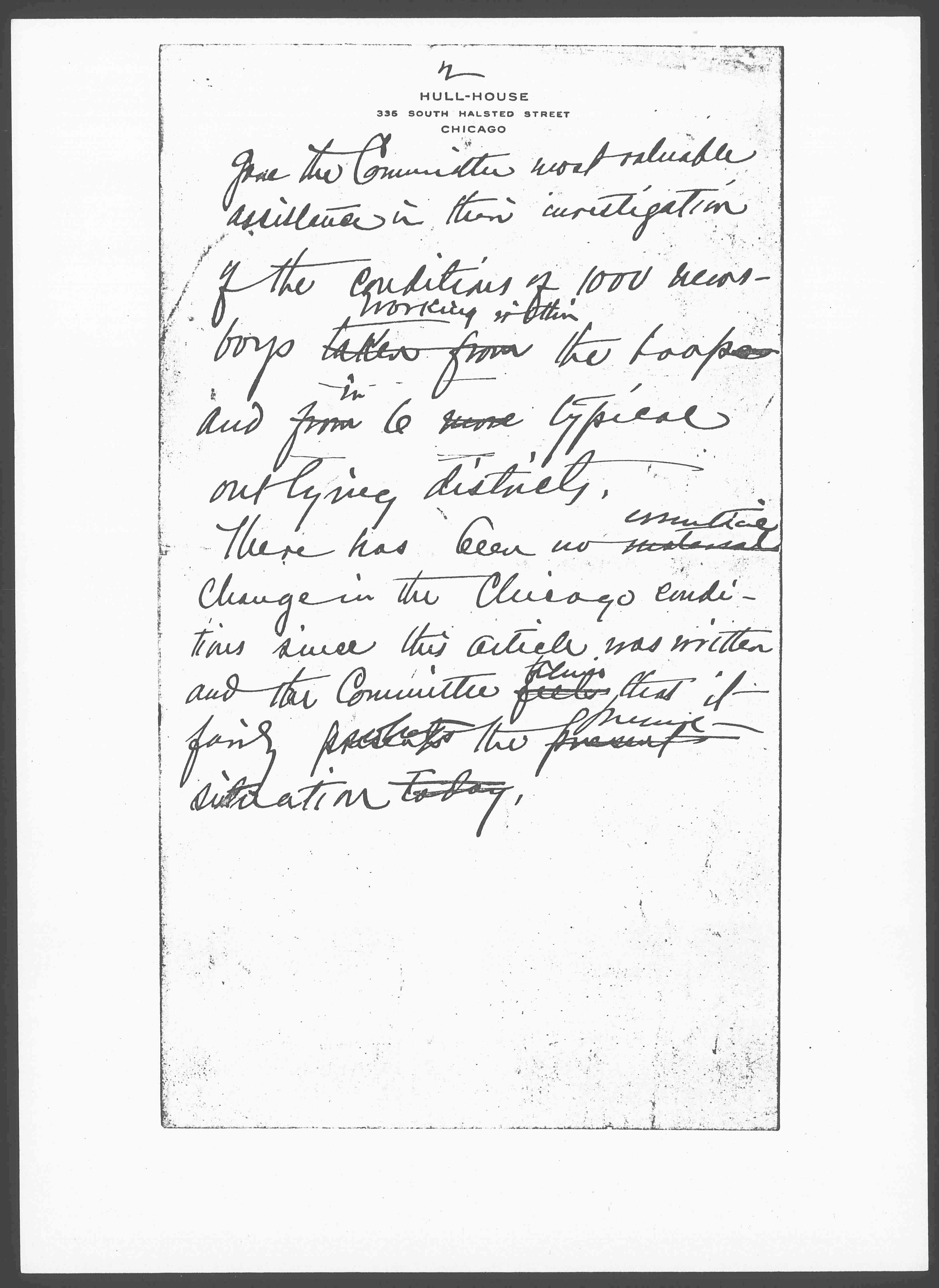 The following article is [filled?] embraces material which was collected on ↑in↓ Chicago ↑Sept, 4 & 5, 1903,↓ under a Committee appointed by the Federation of Chicago Settlements. At that time it was hoped that an ordinance might be secured offering ↑affords↓ some degree of protection to the boys herein described. It has not yet been possible to secure ↑obtain↓ this ↑such a↓ measure and in the belief that the public apathy is the result of ignorance of the real situation ↑tho, Committee [sends? out] offers↓ this reprint has been [one] from the Annals of the American Academy ↑of Pol. Science↓. It is written by Mr. Myron Adams who [page 2] gave the Committee most valuable assistance in their investigation of the conditions of 1000 newsboys taken from ↑working within↓ the loop and from ↑in↓ 6 more typical outlying districts.