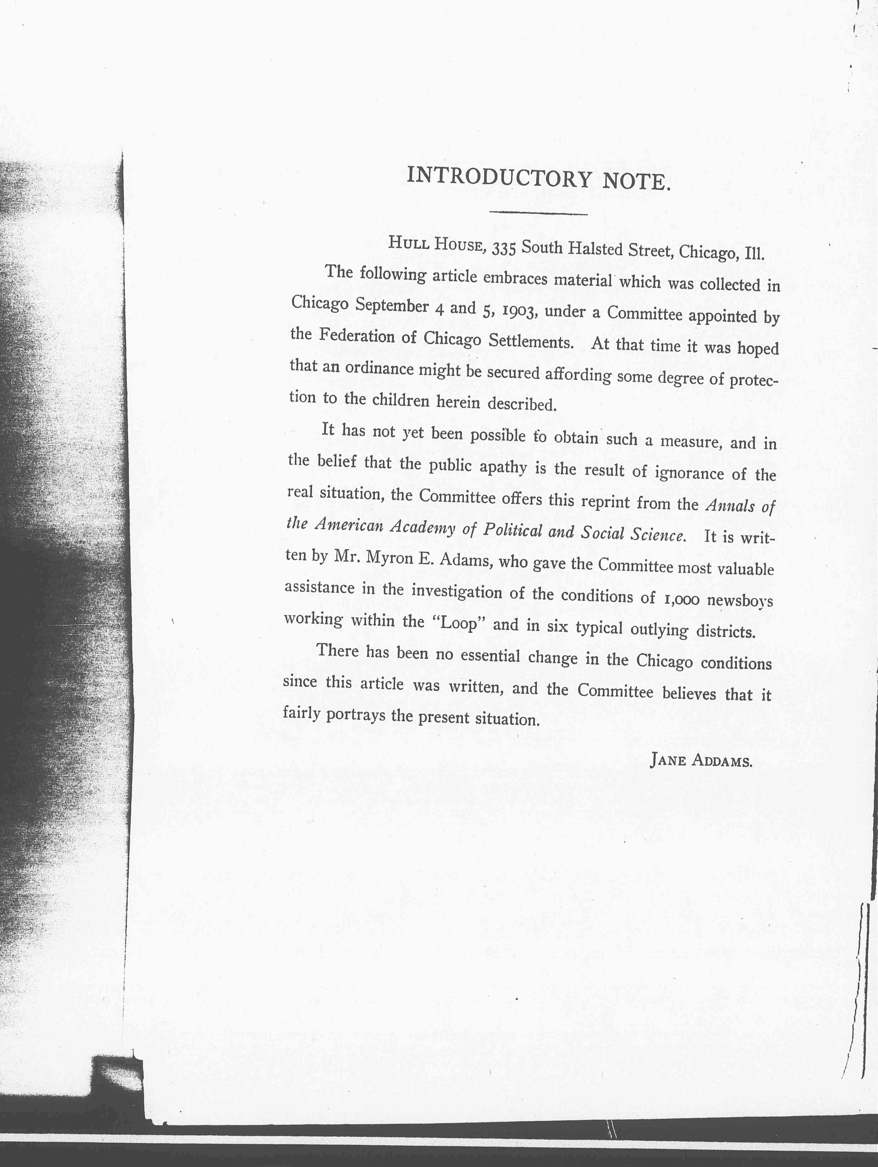 It has not yet been possible to obtain such a measure, and in the belief that the public apathy is the result of ignorance of the real situation, the Committee offers this reprint from the Annals of the American Academy of Political and Social Science. It is written by Mr. Myron E. Adams, who have the Committee most valuable assistance in the investigation of the conditions of 1,000 newsboys working within the "Loop" and in six typical outlying districts.