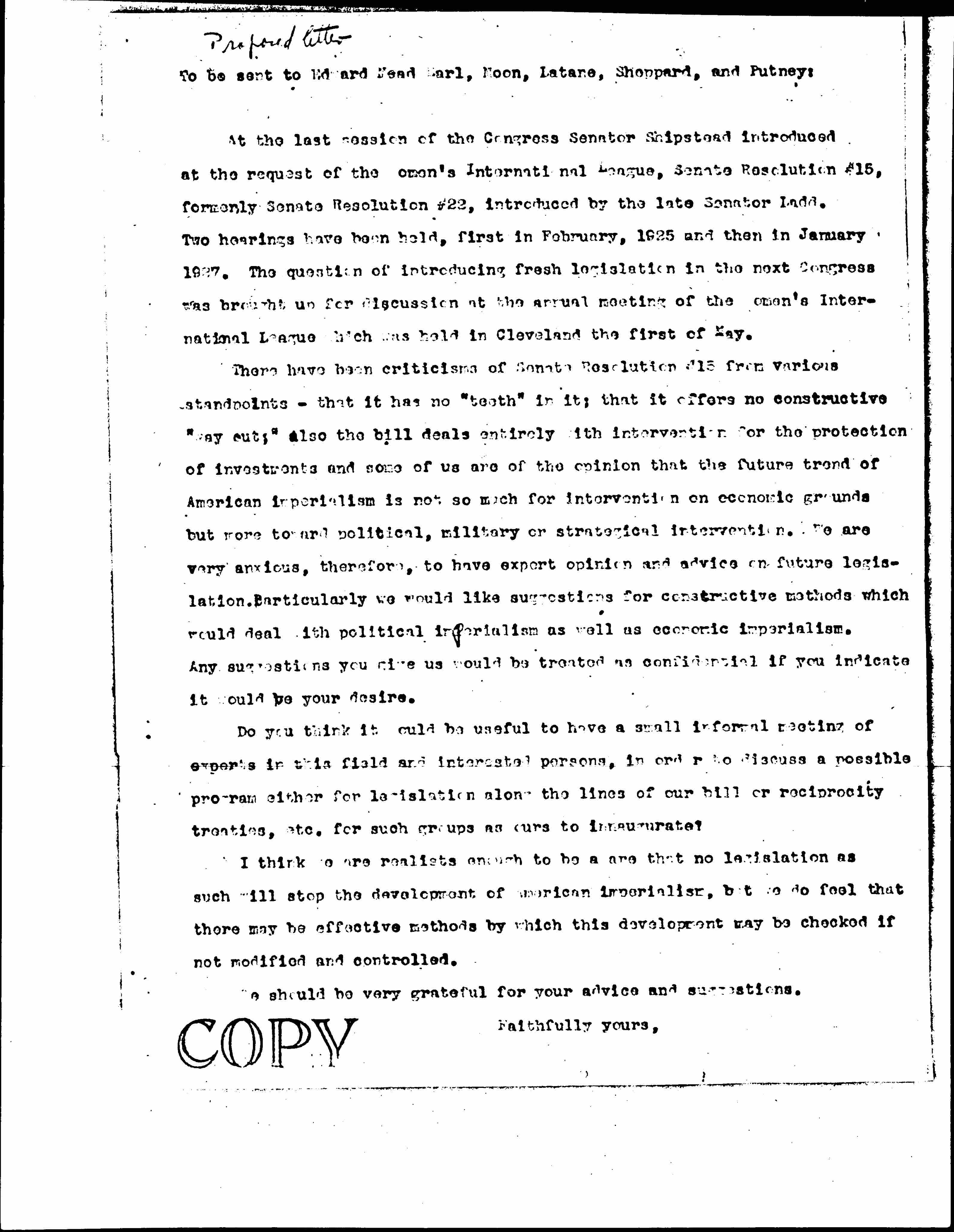 At the last session of the Congress Senator Shipstead introduced at the request of the Women's International League, Senate Resolution #15, formerly Senate Resolution #22, introduced by the late Senator Ladd. Two hearings have been held, first in February, 1925 and then in January 1927. The question of introducing fresh legislation in the next Congress was brought up for discussion at the annual meeting of the [Women's] International League which was held in Cleveland the first of May.There have been criticisms of Senate Resolution #15 from various standpoints -- that it has no "teeth" in it; that it offers no constructive "way out;" also the bill deals entirely with intervention for the protection of investments and some of us are of the opinion that the future trend of American imperialism is not so much for intervention on economic grounds but more toward political, military or strategical intervention. We are very anxious, therefore, to have expert opinion and advice on future legislation. Particularly we would like suggestions for constructive methods which would deal with political imperialism as well as economic imperialism. Any suggestions you give us would be treated as confidential if you indicate it would be your desire.