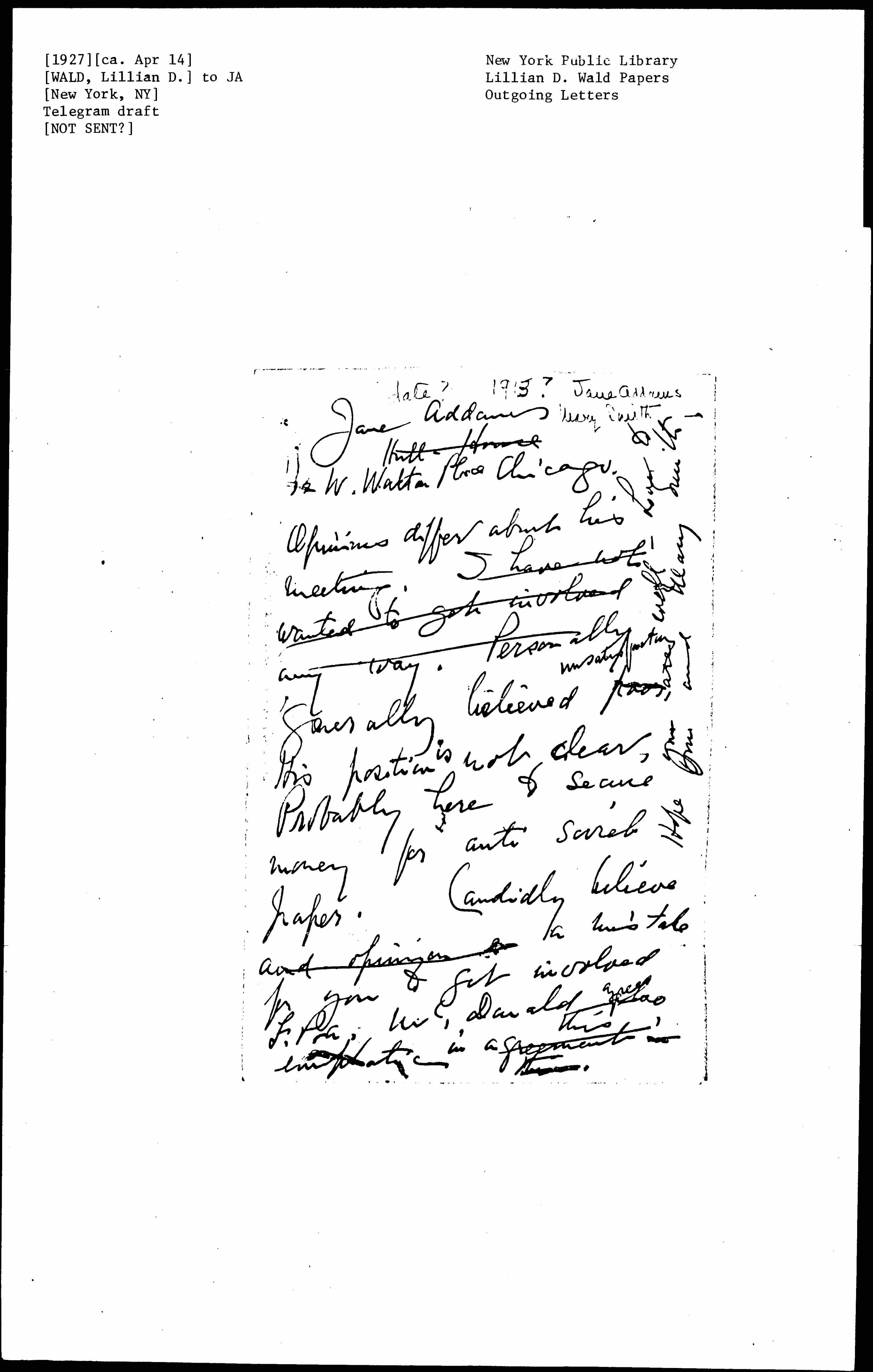 Opinions differ about his meeting. I have not wanted to get involved in any way. Personally generally believed ↑unsatisfactory↓ poor. His position ↑is↓ not clear. Probably here to secure money for anti Soviet paper. Candidly believe and opinion [illegible] a mistake for you to get involved F. [illegible] McDonald [illegible] ↑agrees↓ emphatic in ↑this↓ agreement in [illegible].