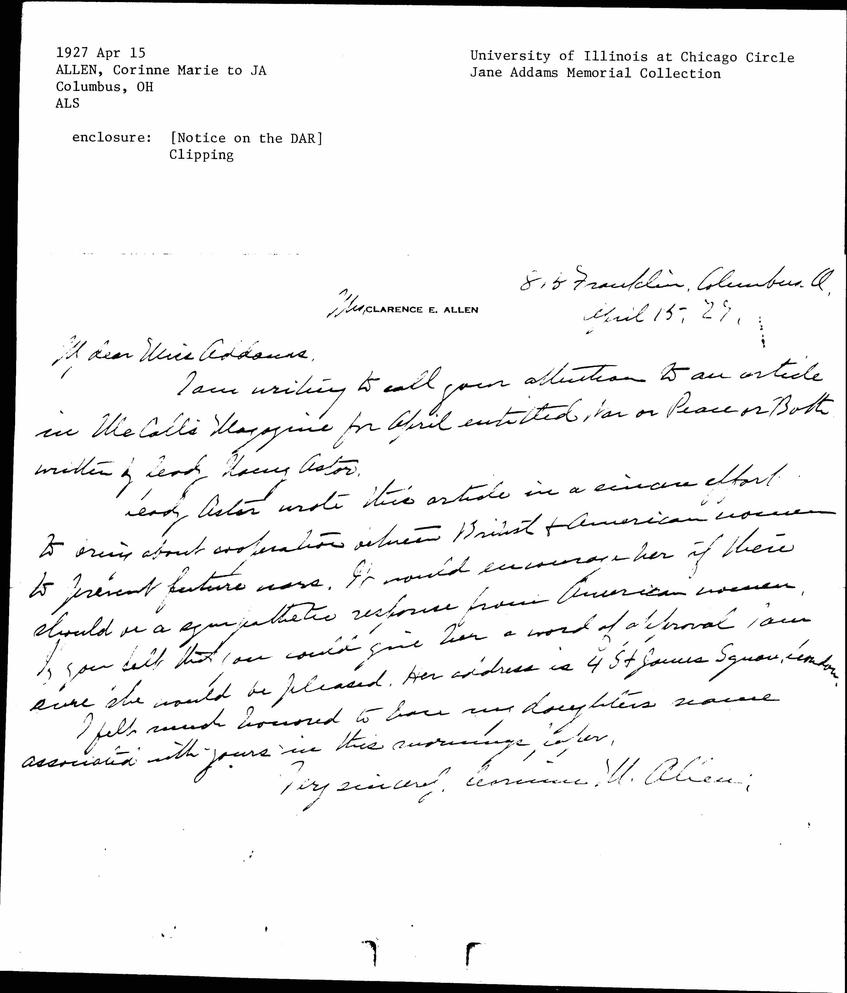 Lady Astor wrote this article in a sincere effort to bring about cooperation between British & American women to prevent future wars. It would encourage her if there should [be] a sympathetic response from American women. If you felt that you could give her a word of approval, I am sure she would be pleased. Her address is 4 St James Square, London.