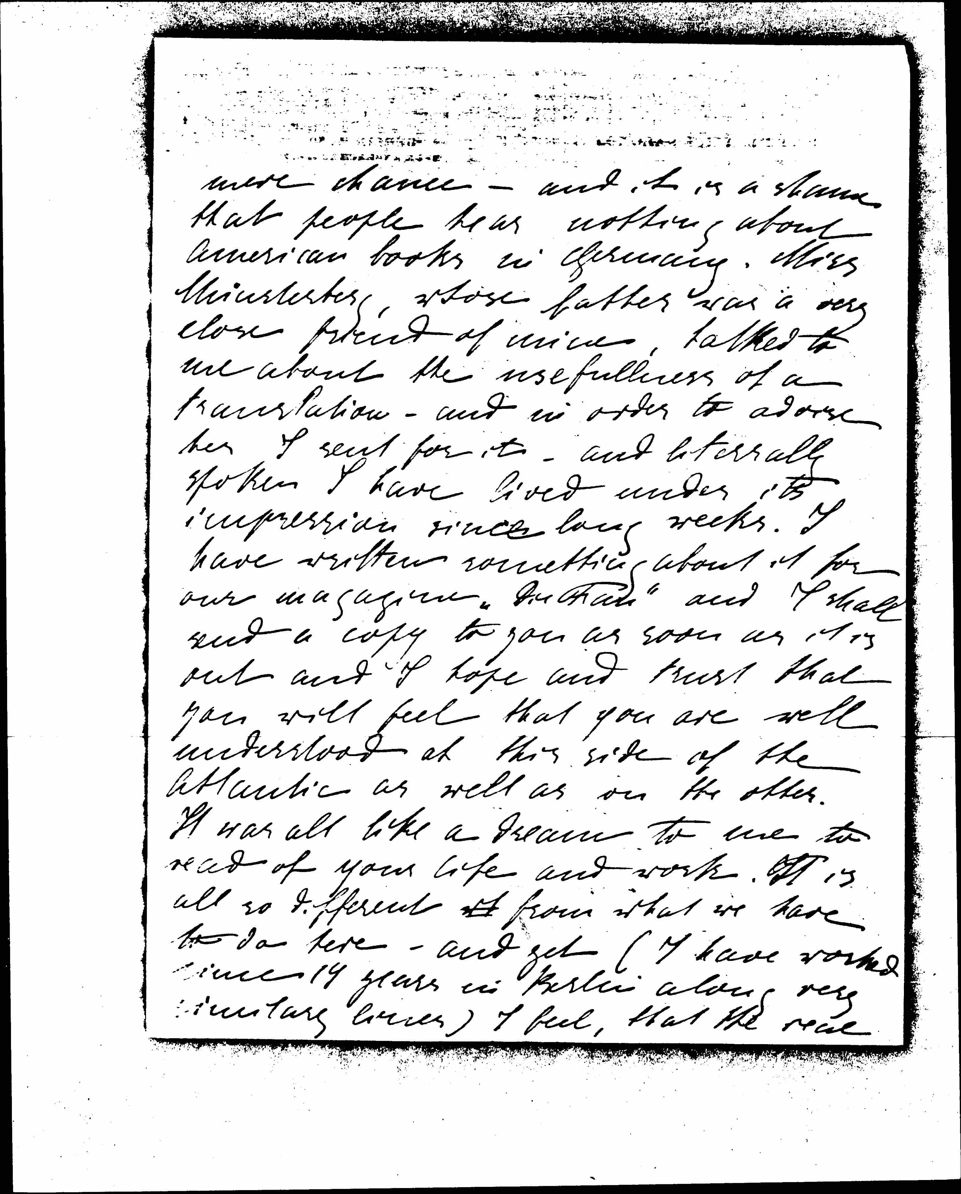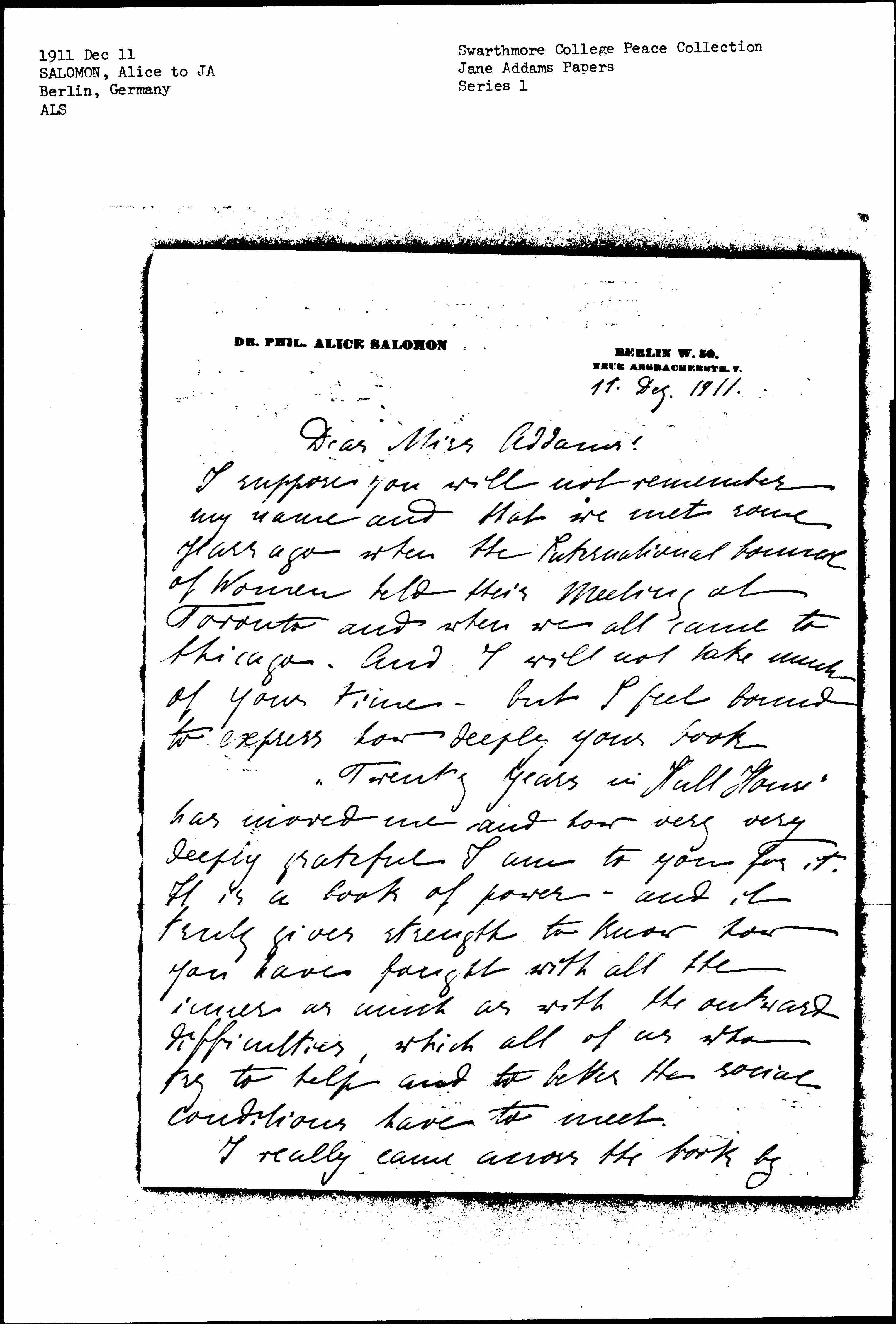 I really came across the book by [page 2] mere chance -- and it is a shame that people hear nothing about American books in Germany. Miss Münsterberg, whose father was a very close friend of mine, talked to me about the usefulness of a translation -- and in order to advise her I sent for it -- and literally spoken I have lived under its impression since long weeks. I have written something about it for our magazine, "Das Frau" and I shall send a copy to you as soon as it is out and I hope and trust that you will feel that you are well understood at this side of the Atlantic as well as on the other. It was all like a dream to me to read of your life and work. It is all so different from what we have to do here -- and yet (I have worked since 14 years in Berlin along very [voluntary] lines) I feel, that the real [page 3] conflicts and difficulties are just the same. The subjective needs of Settlements or of social work as we do it almost expresses the same words <thoughts> which have been the "Leitmotiv" of my life since I was first awakened to see the way out of the unnatural lives of the wealthy girls, and all the different attempts of socialists and "single tax people" and others brought back all the days of my youth, when "Bebel" and "[Damaschke]" and all these people thought it worth while to try and convert me to their creeds and much more than that: all the same thoughts and troubles about the way of really helping our poorer brothers, the constant difficulty, how to arrange our own life according to our belief in social justice: but [after] all this the difference [page 4] between your strength of mind and soul -- and my poor small attempts, the difference between what you have done for your country and my small influence.
